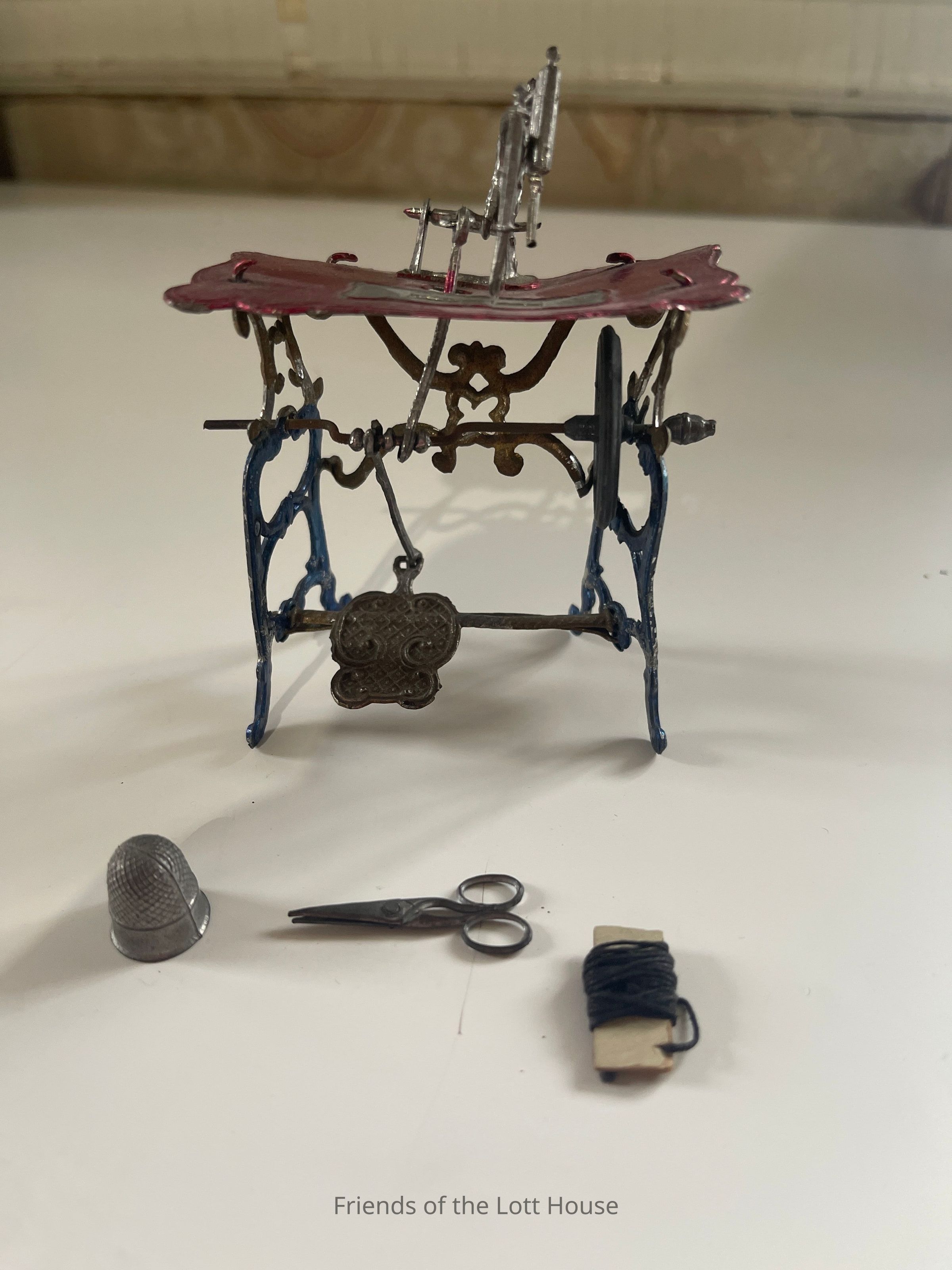 Miniature sewing machine with thumbnail, scissors, and threadContext