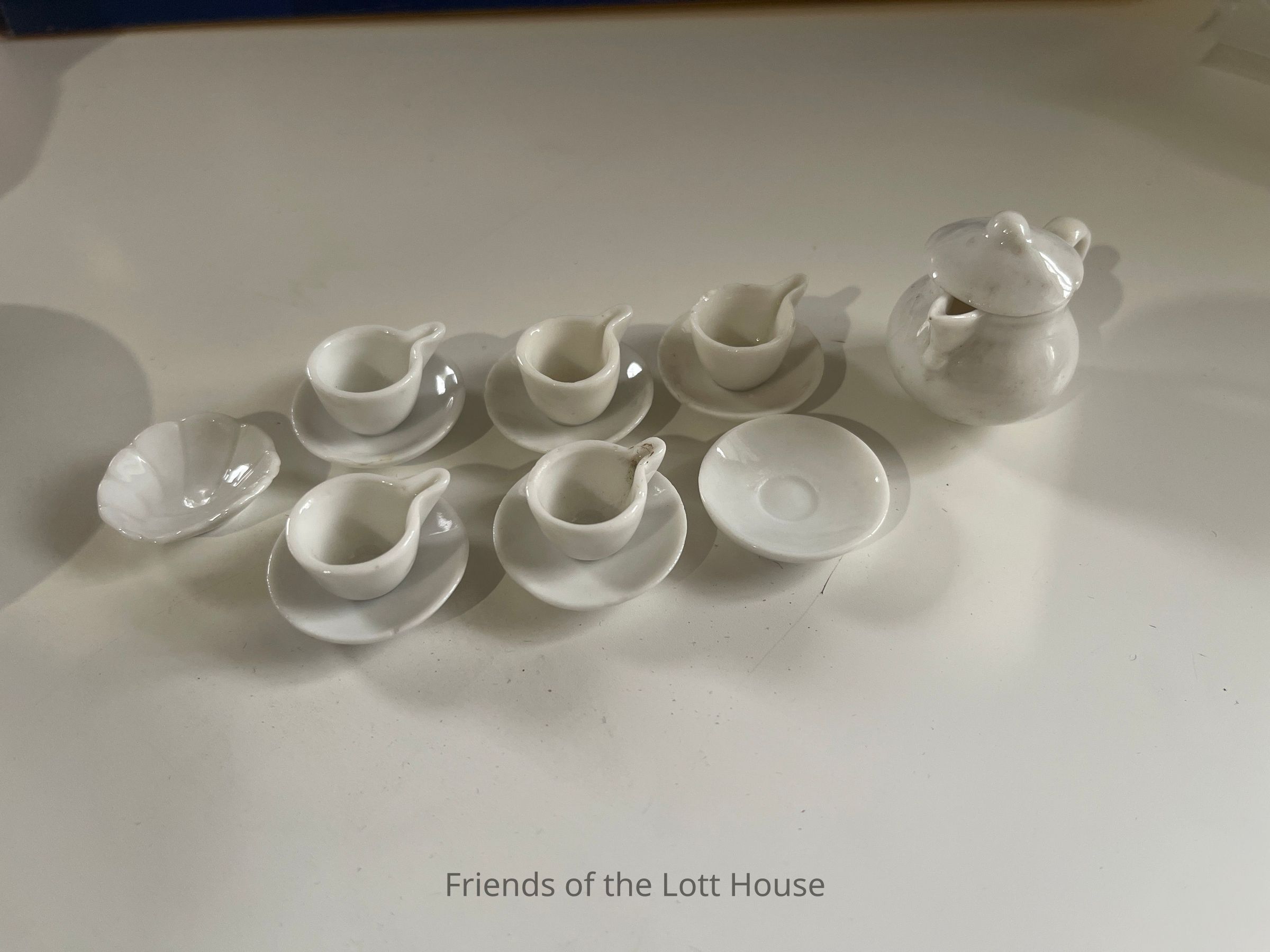 Minatare Tea Set includes, 6 saucers, 5 tea cups, 1 small shell design plate, and one tea pot.Context