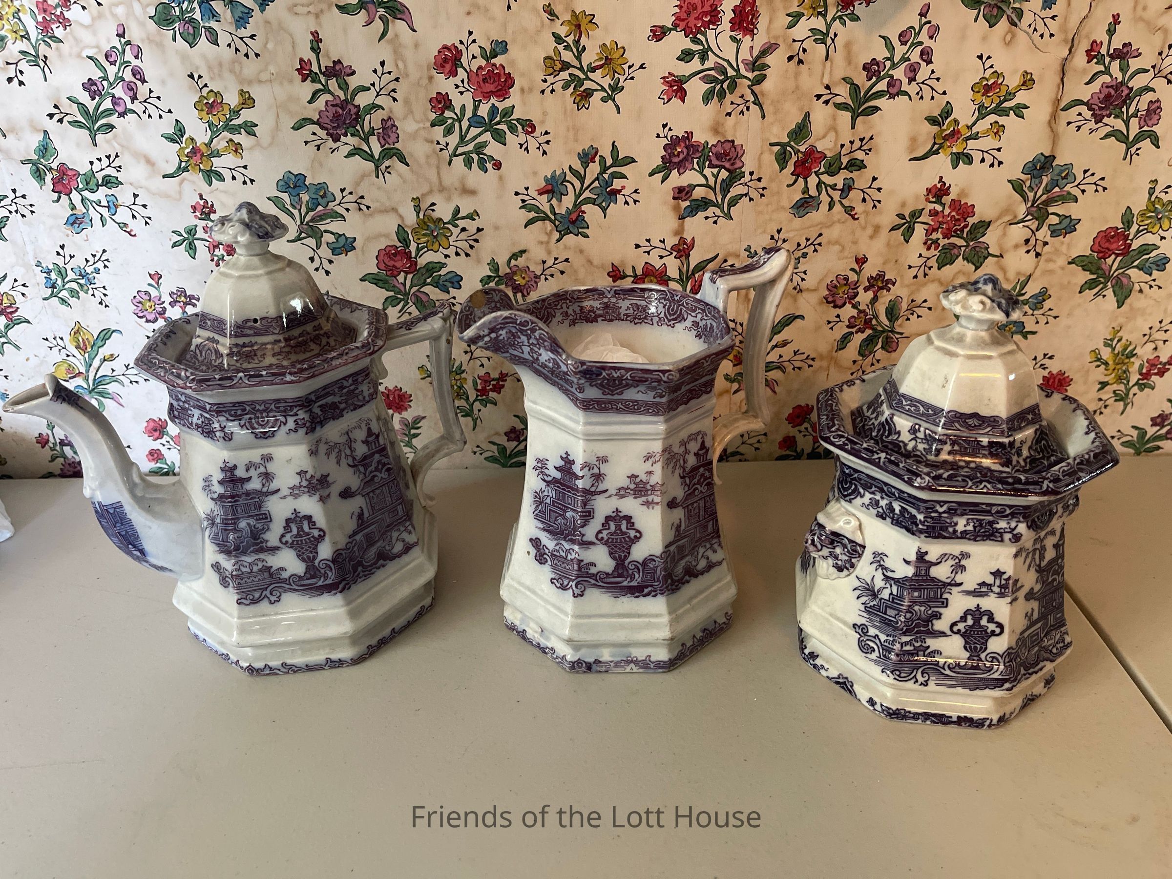 Teaset consisting of Teapot w/lid, with molded floral finial and, molded handle and spout; sugar bowl w/lid with molded floral finial and molded lion head handles; water pitcher. Flow blue, dark blue Chinoisserie pattern. Transitional pearlware to whitewareCollection