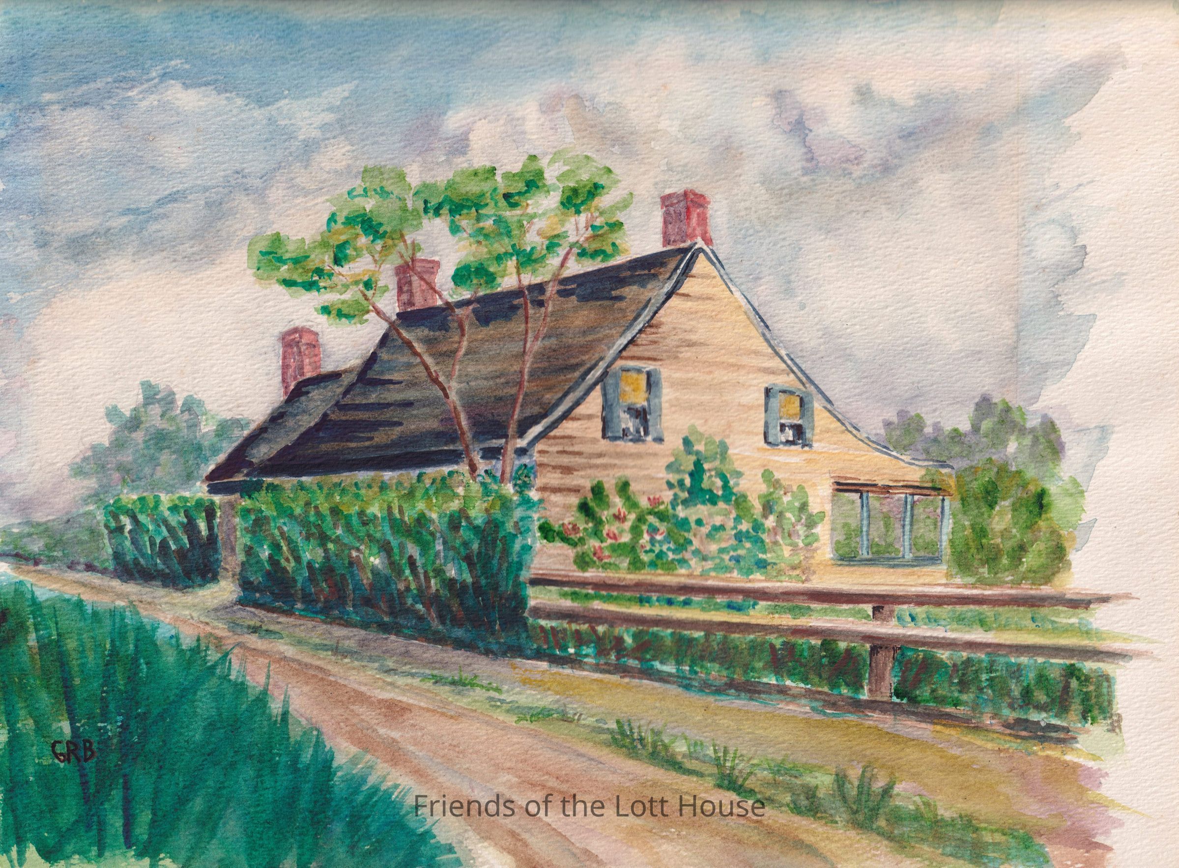 Watercolor painting of Voorhees-Stillwell House, Neck Road near Sheepshead Bay Road. Painted by Gertrude Ryder Bennett from a picture in the Long Island Historical Society files. Setting for the “Ballad of Stephen Voorhees”. Signed GRB. Unframed.Type of Painting