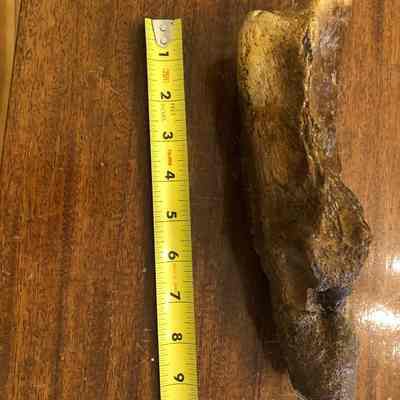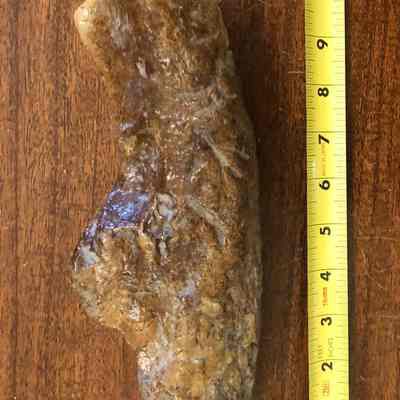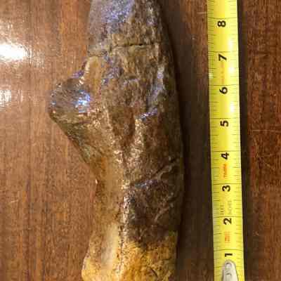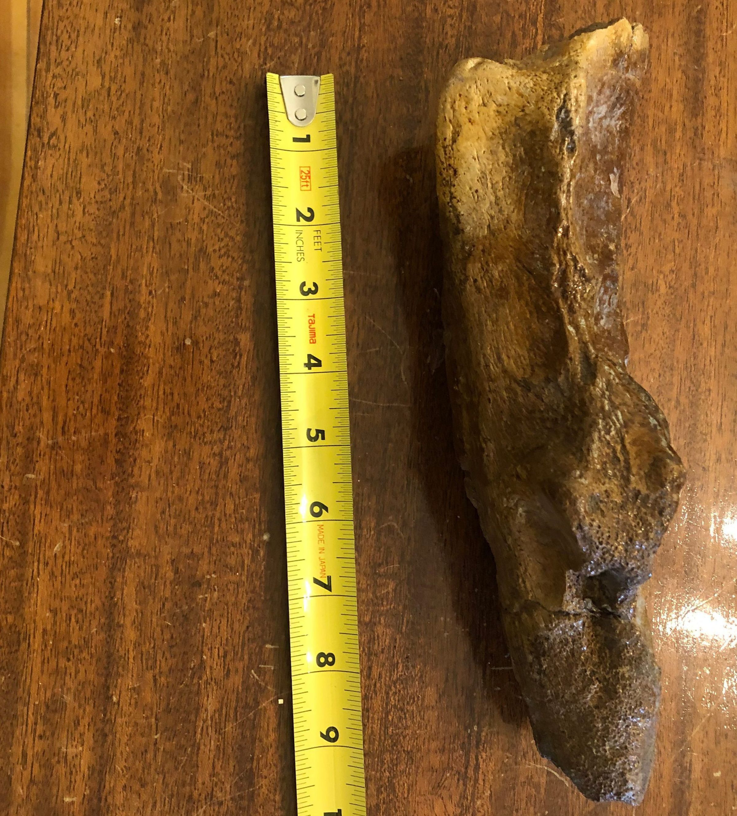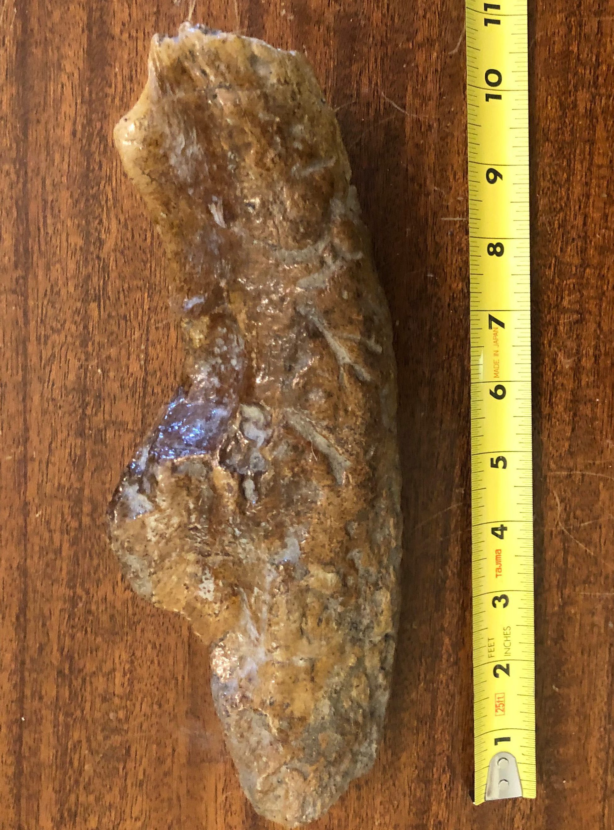 Unidentified bone is weathered and tumbled with strange gouges, possibly had been chewed on. Bone was urethane varnished and note the lighter section at the end was exposed sand bleached by the sun, while the darker section was buried in the clay and sand medium on a hillside.
