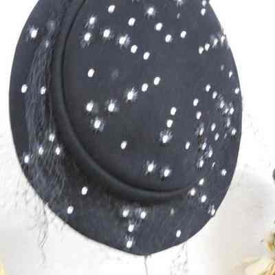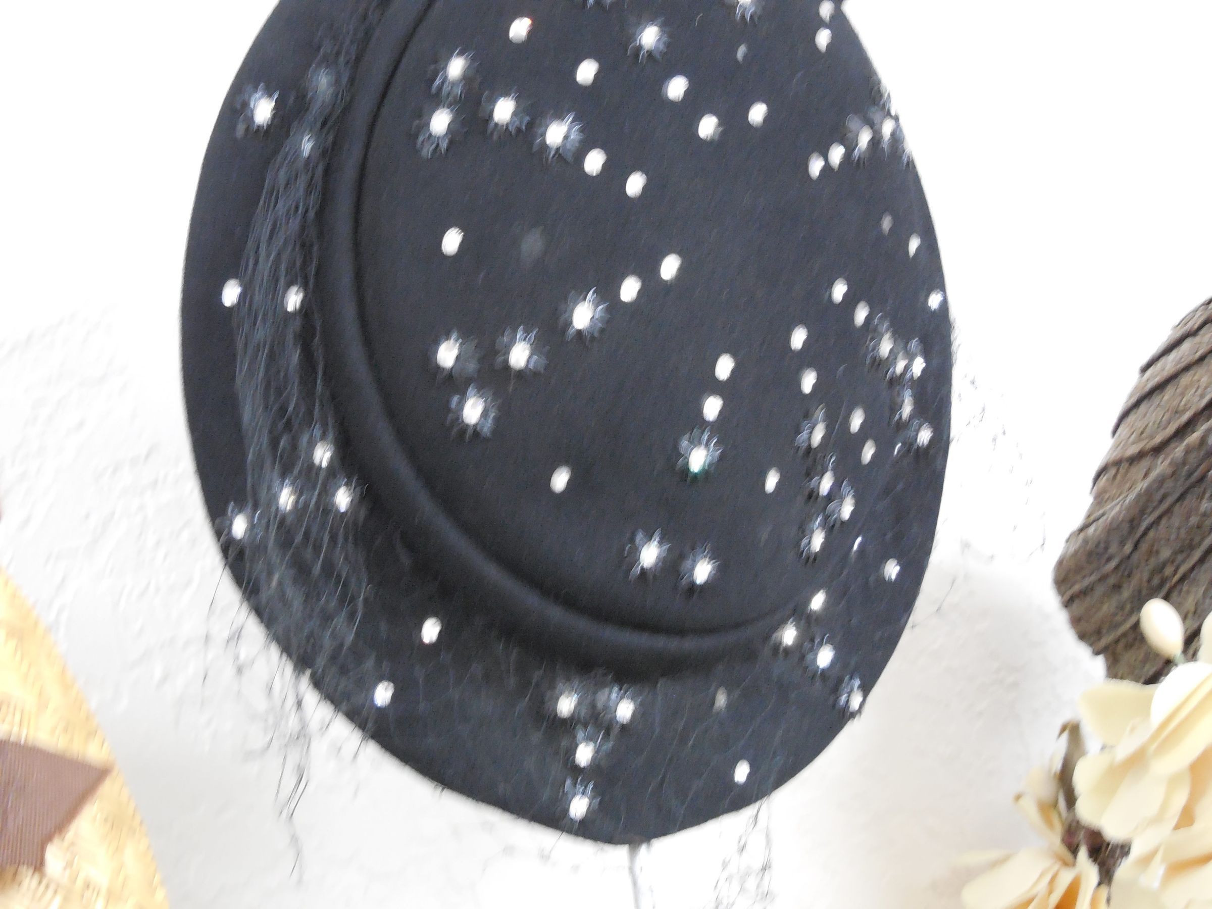Black wool studded with rhinestones and black plastic starbursts, black netting, and felt ribbon.Collection