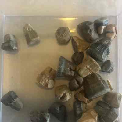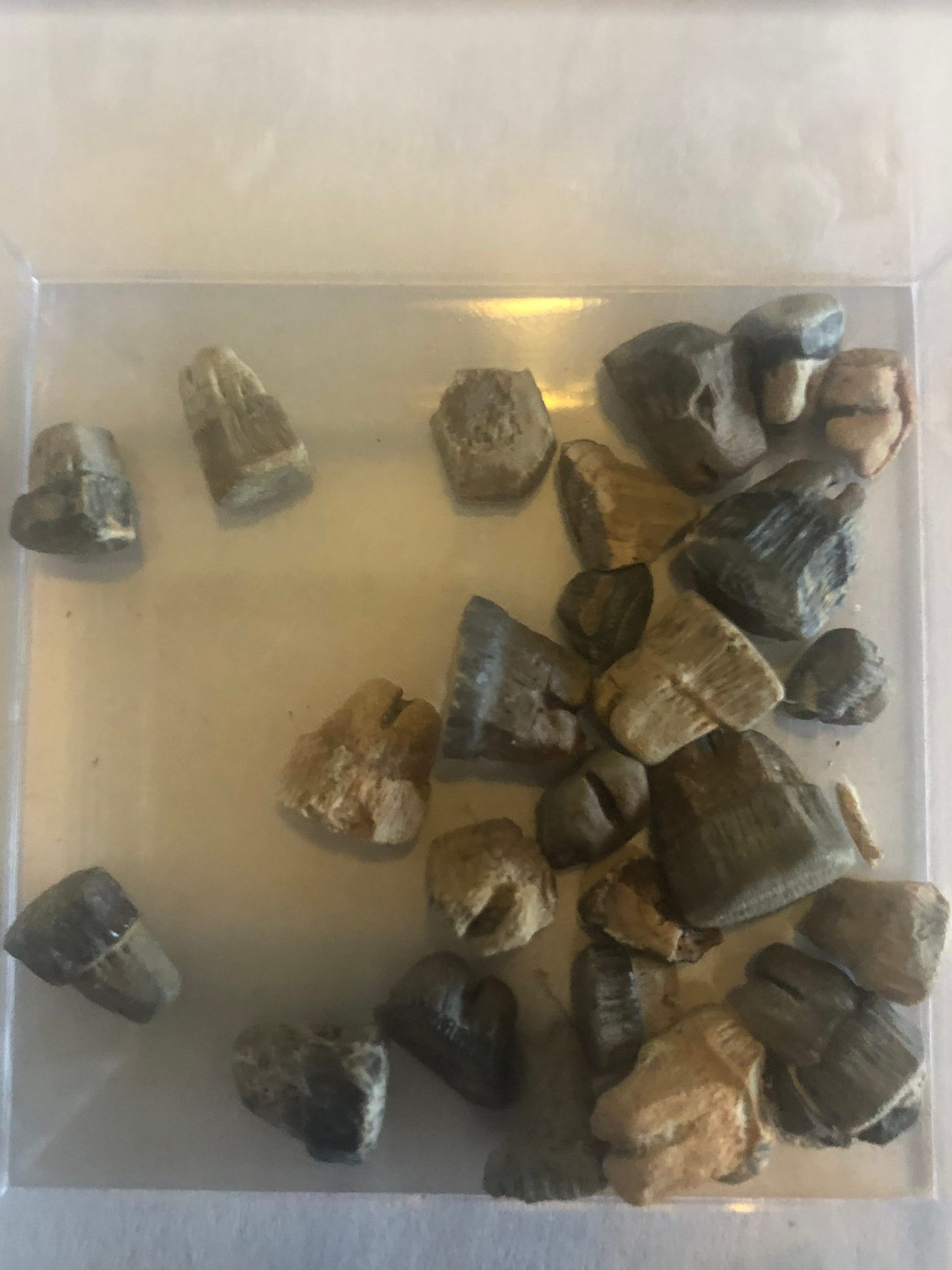 Stingray teeth. Very distinctive shape. Root has a split and the top has a hexagon shape.
