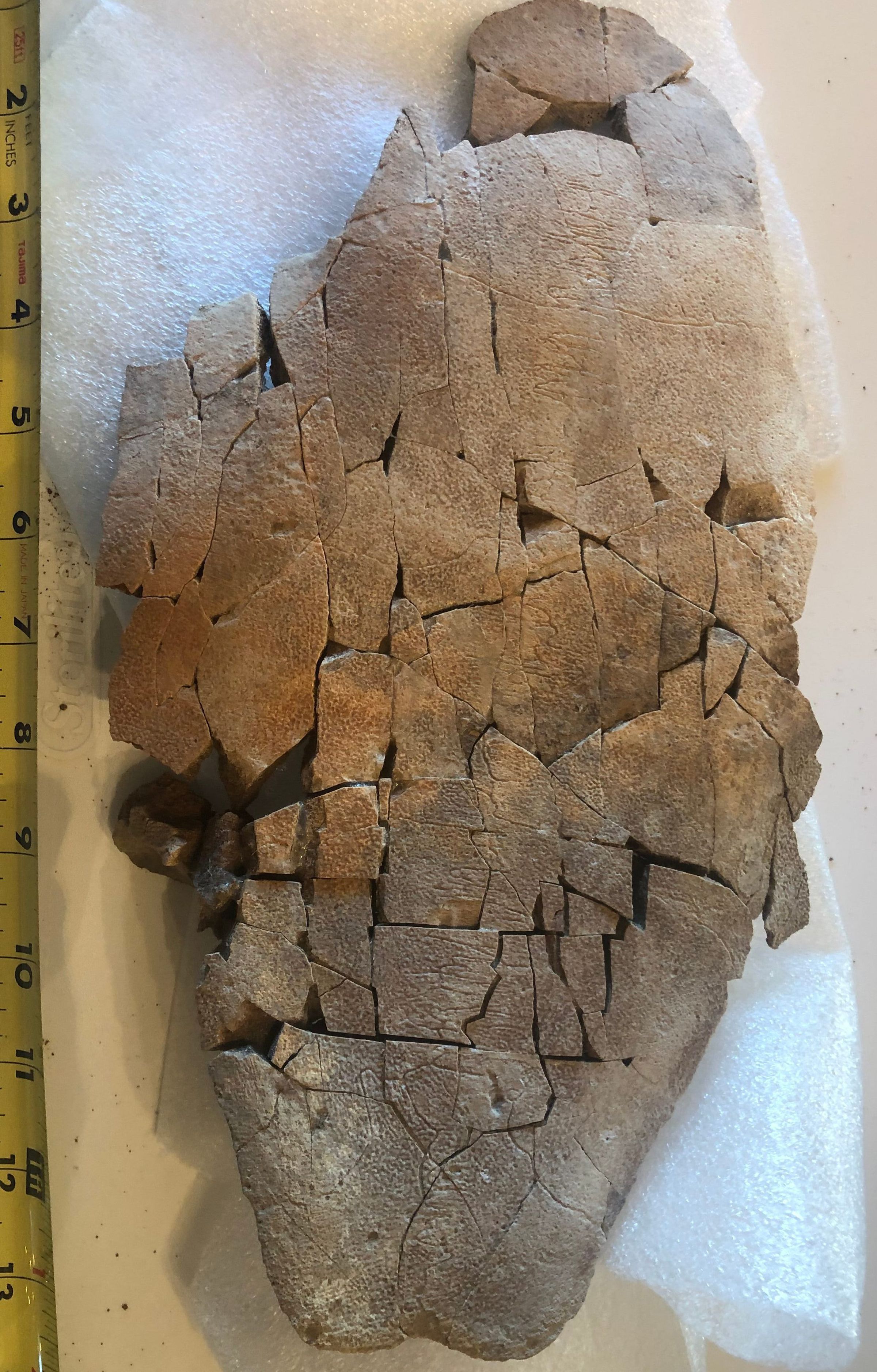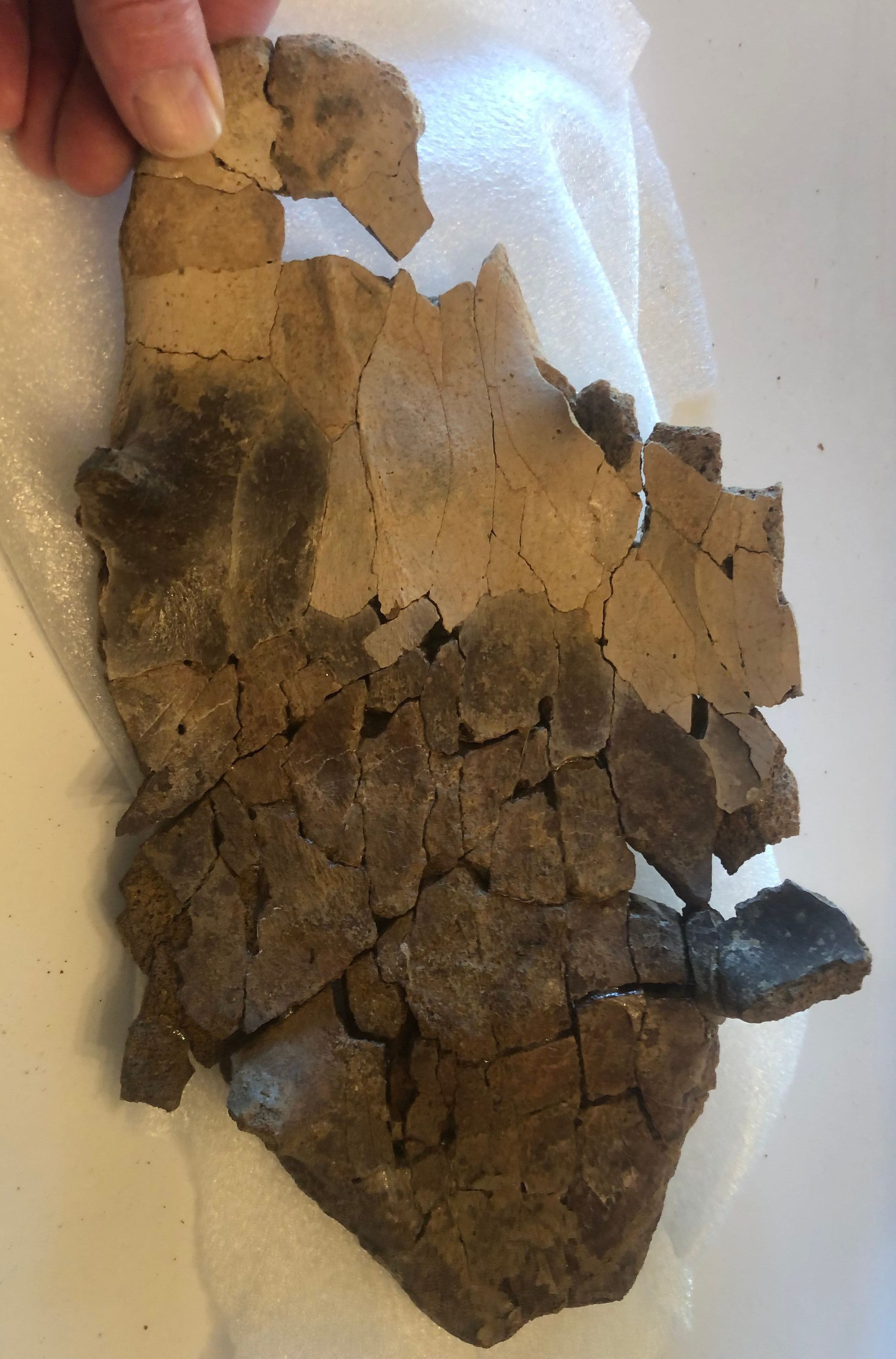 Turtle shells scutes are a common Late Cretaceous fossil. The majority are scattered pieces. A complete shell section is a rare find and is generally fractured. The restoration is a jig saw puzzle experience, fitting and gluing the pieces back together. Many times brought in from the field in a cloth sack of pieces.