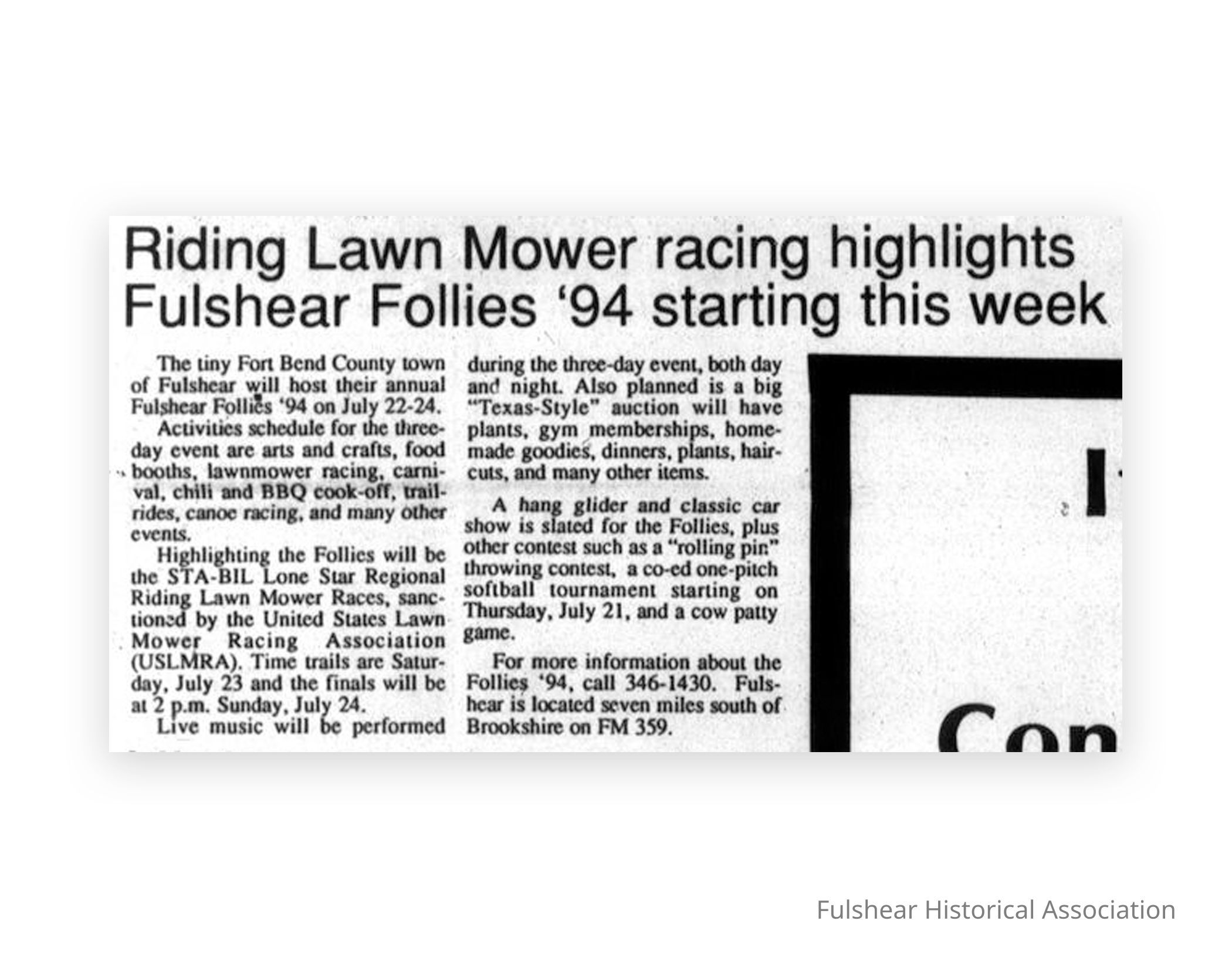 Petrusek, Wilma. The Sealy News (Sealy, Tex.), Vol. 107, No. 20, Ed. 1 Thursday, July 21, 1994, newspaper, July 21, 1994; Sealy, Texas. (https://texashistory.unt.edu/ark:/67531/metapth1559166/m1/20/?q=%22Fulshear%20Follies%22: accessed September 22, 2025), University of North Texas Libraries, The Portal to Texas History, https://texashistory.unt.edu; crediting Virgil and Josephine Gordon Memorial Library.