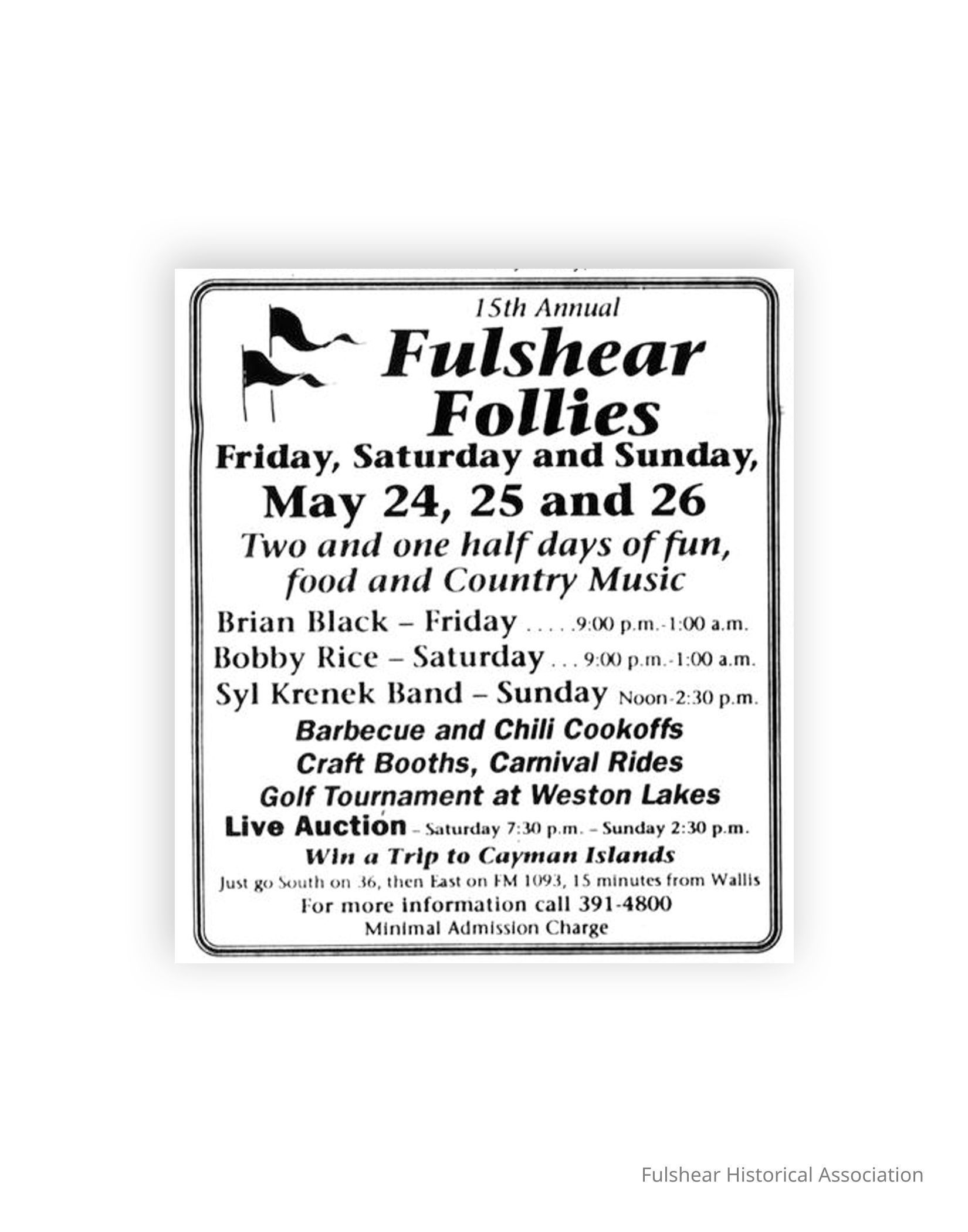 Petrusek, Wilma. The Sealy News (Sealy, Tex.), Vol. 104, No. 11, Ed. 1 Thursday, May 23, 1991, newspaper, May 23, 1991; Sealy, Texas. (https://texashistory.unt.edu/ark:/67531/metapth1559105/m1/10/?q=%22Fulshear%20Follies%22: accessed September 22, 2025), University of North Texas Libraries, The Portal to Texas History, https://texashistory.unt.edu; crediting Virgil and Josephine Gordon Memorial Library.