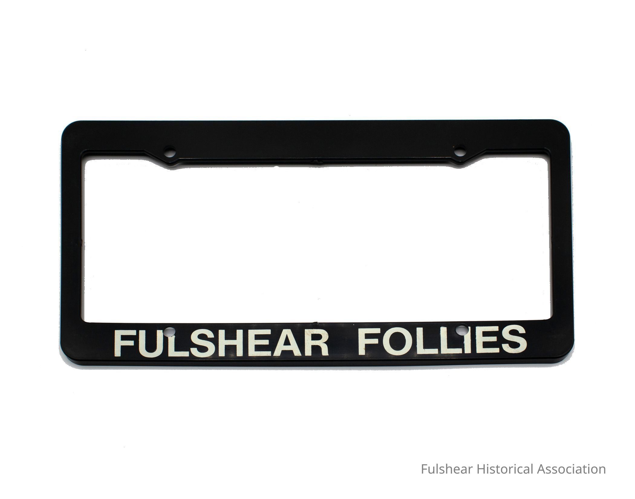 A license plate frame used as advertisement for Fulshear Follies (year unknown)