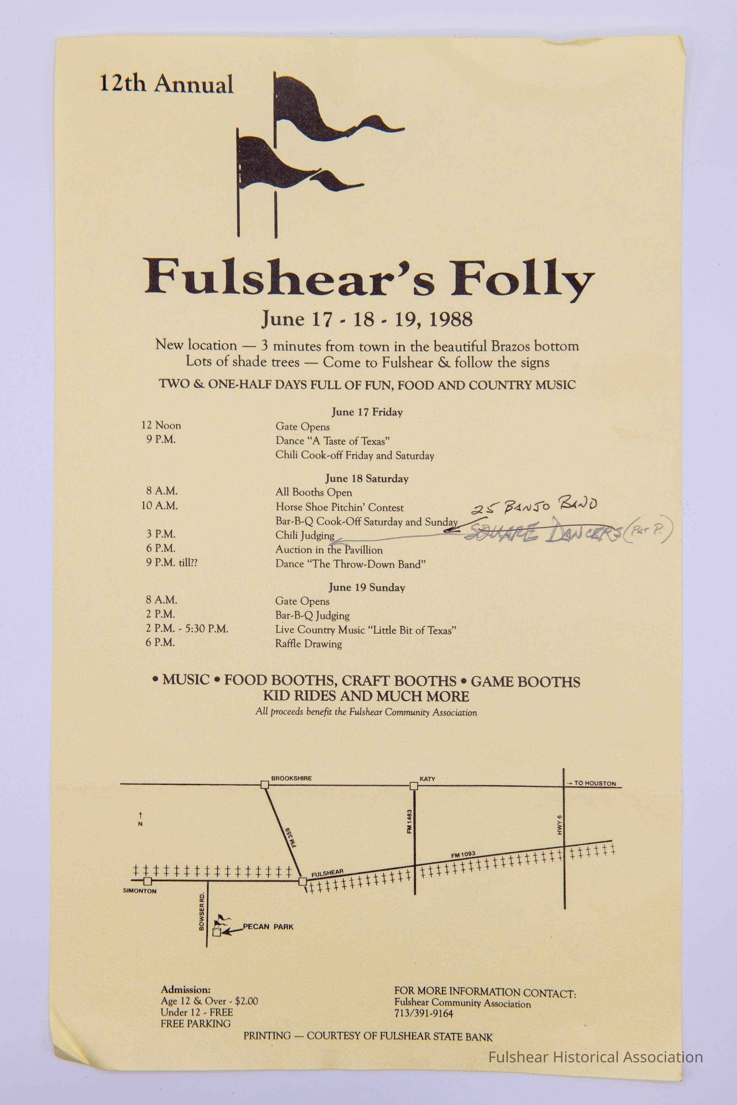 Paper flyer advertisement for the 12th annual Fulshear's Folly
