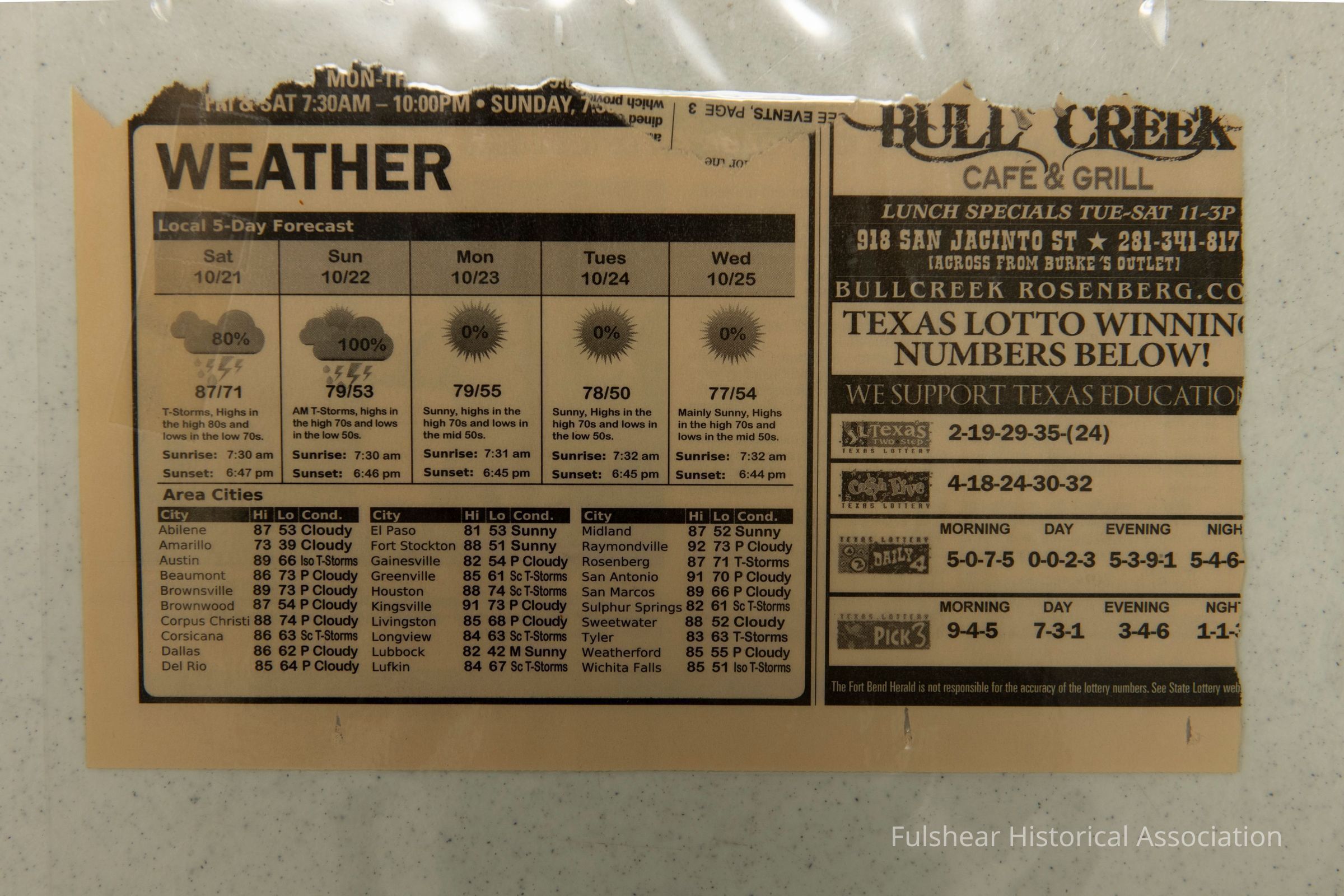 DIGITIZATION & FAIR USE: This item was contributed for digitization by a community member and digitized by the Fulshear Historical Association (FHA), or sourced online and shared in accordance with Title 17 U.S.C. Section 107. The digital image(s) provided here are made available for non-commercial, research, educational, and informational purposes. COPYRIGHT: The FHA does not own or maintain the physical item featured in the provided digital image(s). The copyright of the original work remains with the creator or rights holder. Any reproduction, distribution, or commercial use may require permission from the original copyright holder. PRIVACY: The Fulshear Historical Association (FHA) endeavors to respect individual privacy in presenting community-sourced items. Personal information (such as addresses, phone numbers, or other identifiers) may be redacted from digital surrogates when appropriate. To request removal of information, please email Fulshear Historical Association.