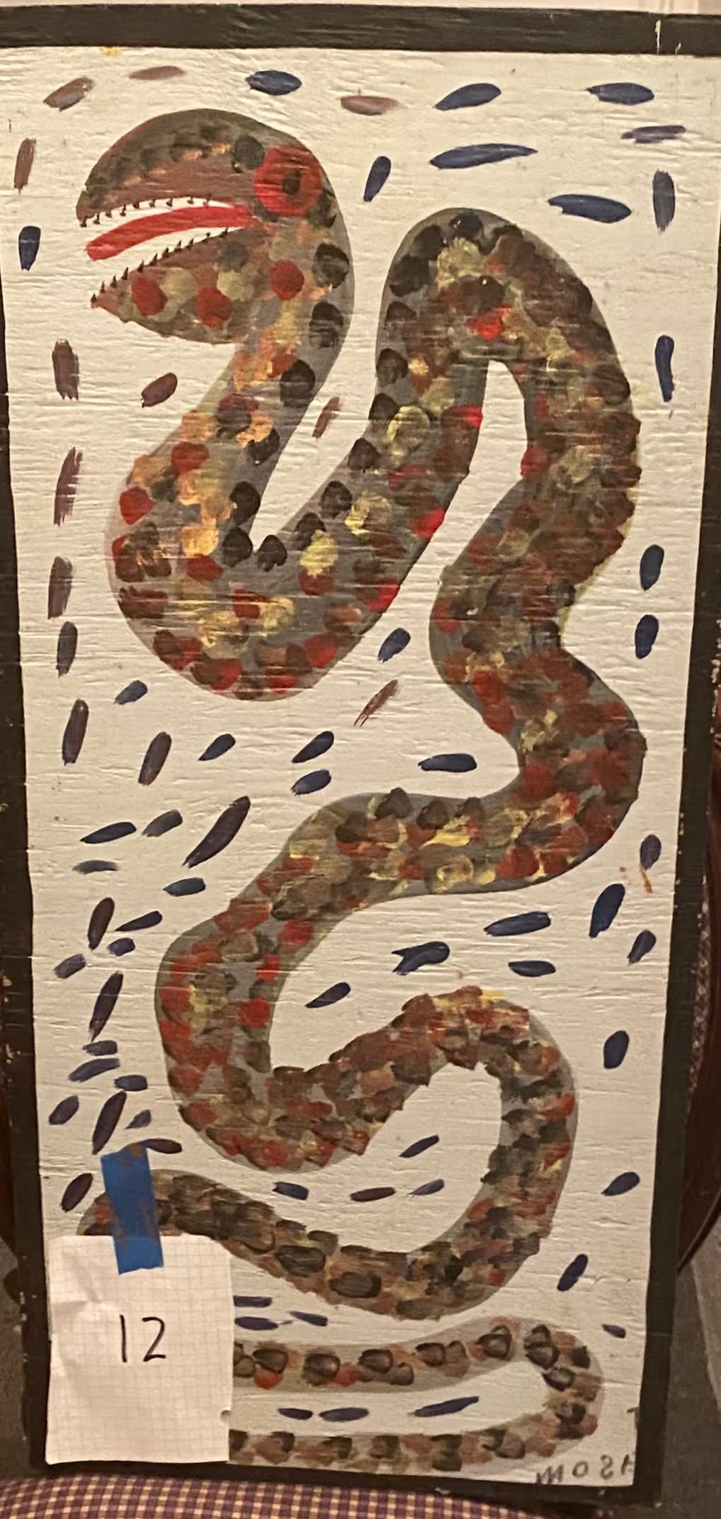 Chicken Snake by Mose Tolliver features a snake rendered in browns, reds, yellows, and black on a white background, surrounded by more neutral swipes of paint. The strong vertical orientation of the work makes the snake appear to be standing upright, balanced on its tail. The tail curves and thickens from bottom to top and directs the viewer’s eye about the picture plane. At the top of the composition, the snake’s mouth is open and a red tongue pokes out from in between rows of teeth. In addition, the semi-regular dotted pattern on the body of the snake mimics the texture of scales. Overall, the dashed and dramatically-curving lines in Chicken Snake contribute tremendous energy to this dynamic image of a coiled snake posed to strike.Acquisition