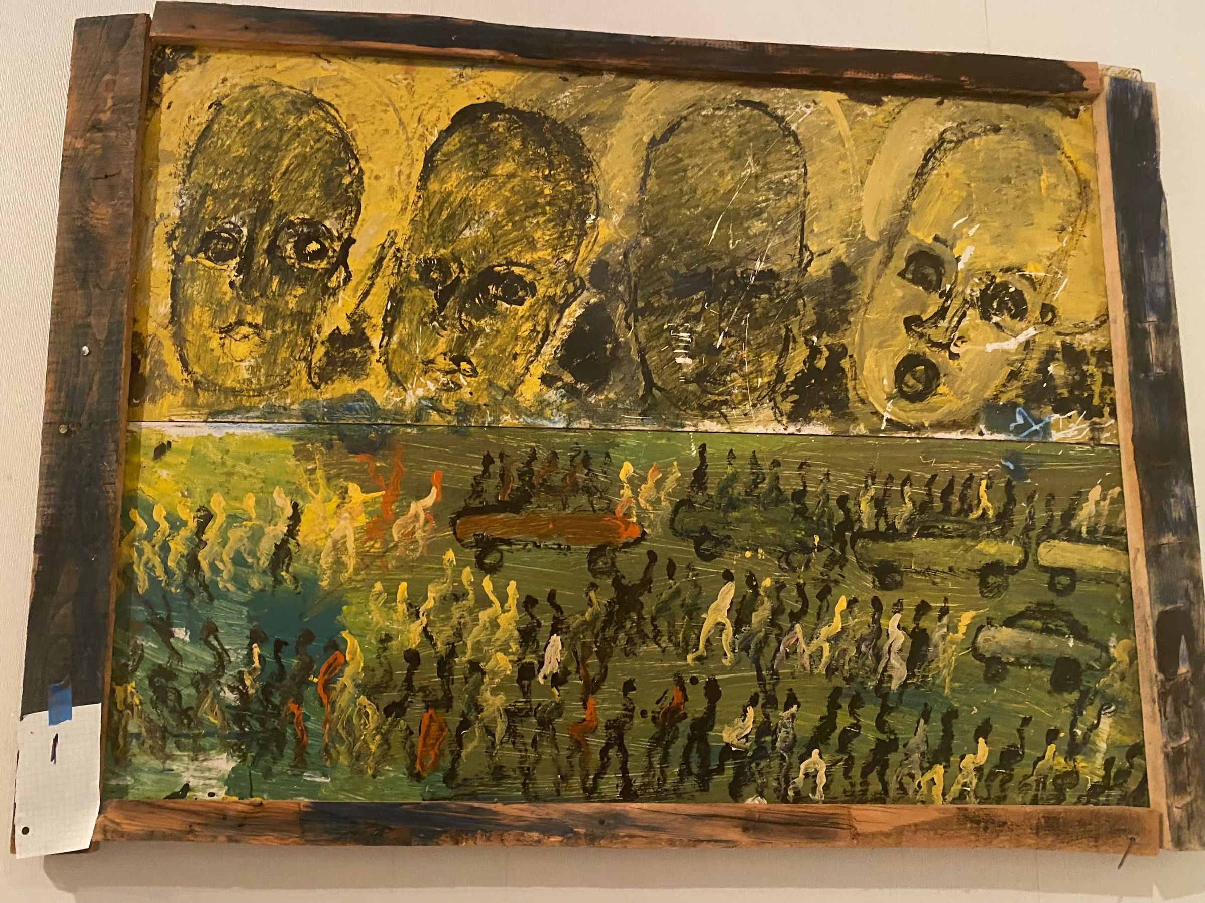 This large-scale painting by Purvis Young is encased in a makeshift scrap board frame and, like many of Young's artworks, was rendered on castoff wood panels. Two boards are stacked lengthwise to form the full body of this work. The top register features four faces staring out at the viewer. These faces, rendered in black and yellow, appear to be crowned by gold halos and sport a variety of expressions, from gaping mouths (far left and far right) to downcast eyes (middle right). The bottom half of the painting features several figures in black, white, red, and yellow, all arranged in lines that curve with the hilly green landscape. A red and green car filled with figures can also be seen in the top center of the work.Acquisition