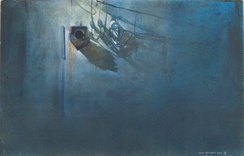 A 20th century American watercolor on board by Dean Mitchell (b. 1957 Quincy, Florida). A hazy scene of the outside of a building at night. Executed primarily in shades of blue.Artwork Details