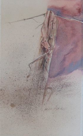 Painted by Quincy native Dean Mitchell, this early watercolor painting consists of the image of a decaying old fence post, held up by its barbwire and rusty nails. Mitchell would have painted this while still in high school. The painting is executed in muted colors of tans, red, and browns, and the fence post floats in a barely sketched foreground in the upper two-thirds of the painting.Artwork Details
