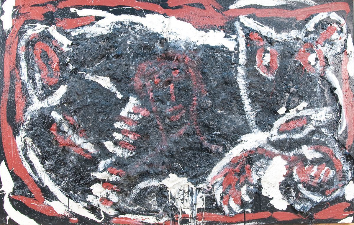 Big Black Bear Trying to Survive is typical of the large sculptural assemblages Thornton Dial, Sr. was creating in the 1990s. These works are intricate, thoughtful compositions always contain a message, often dealing with race and inequality in America and male-female relationships. These large-scale works are created with items Dial would find in his yard or in the trash. Dial liked to create his artwork with materials others have thrown away. Big Black Bear Trying to Survive is composed of various scrap metal, carpets, and trash bags and depicts a large black bear laying on its side intently staring out at the viewer. The Gadsden Arts Center exhibited this work in the exhibition, Vernacular Art from the Hill Collection, August 28 - October 25, 2009.Collection