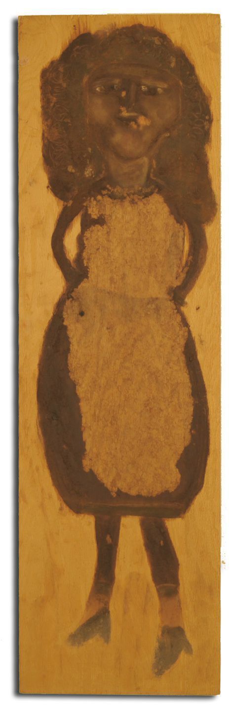 This is a painting of an African-American woman in an apron and heels, which was a common subject for Jimmy Lee Sudduth. Sudduth was renowned for his inventive and joyful mud paintings on wood, and his subject matter ranged from southern mansions and cotton picking to Manhattan skylines; however, he mainly depicted the people and places of his hometown, Fayette, Alabama. Sudduth used a combination of substances including dirt, clay, berry juices, leaves, sugar, coffee grounds and ashes for his paintings. He used his fingers to apply his "paint" because "they never wore out." The Gadsden Arts Center exhibited this work in the exhibition, Vernacular Art from the Hill Collection, August 28 - October 25, 2009.Artwork Details