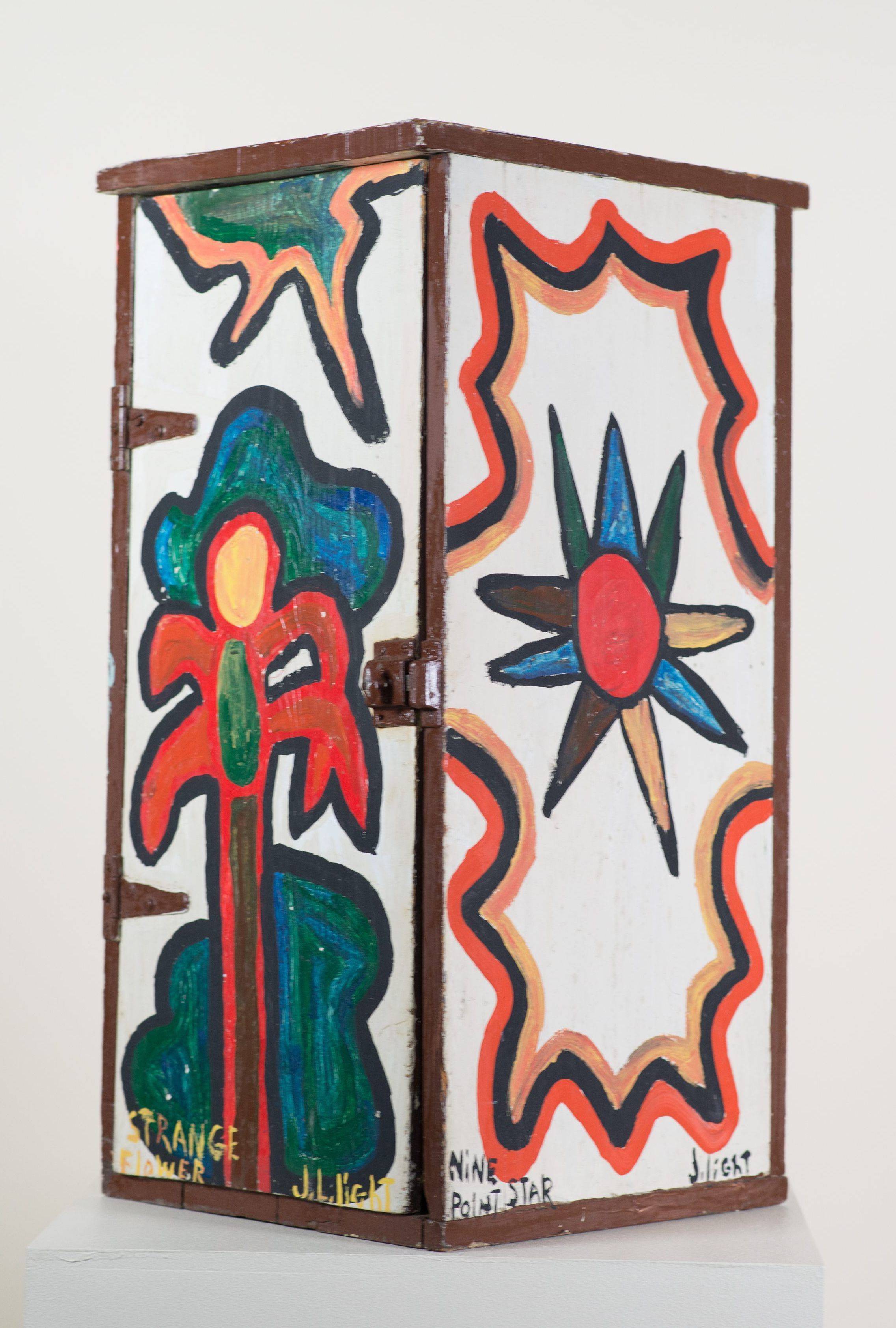 In this 3D work, Light painted scenes on each side of a cabinet; including the top. The scene painted on the cabinet's door is titled Strange Flower, the ride panel, featuring a bright sun-like figure, is titled Nine Point Star. The back of the cabinet Light depicts a rainbow flower called Color Flower, and on the cabinet's left, he paints the striking face of a black man with fangs and a large bowtie. This scene is titled Adolf Hitler. The top of the cabinet portrays a brightly painted pattern of wavy lines and angled shapes. This scene is called Rainbow=One.Collection