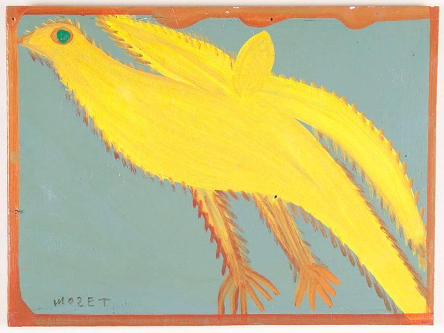 Mose Tolliver often painted images of animals, and his subjects usually took up the majority of the picture plane and were surrounded by a painted border. Golden Eagle depicts a yellow bird beginning to take flight against a bight blue sky. A reddish/brown border closely surrounds the bird. Like with many of his works, Tolliver attached a soda can tab to the painting as a hanging device. The Gadsden Arts Center exhibited this work in the exhibition, Vernacular Art from the Hill Collection, August 28 - October 25, 2009.Collection
