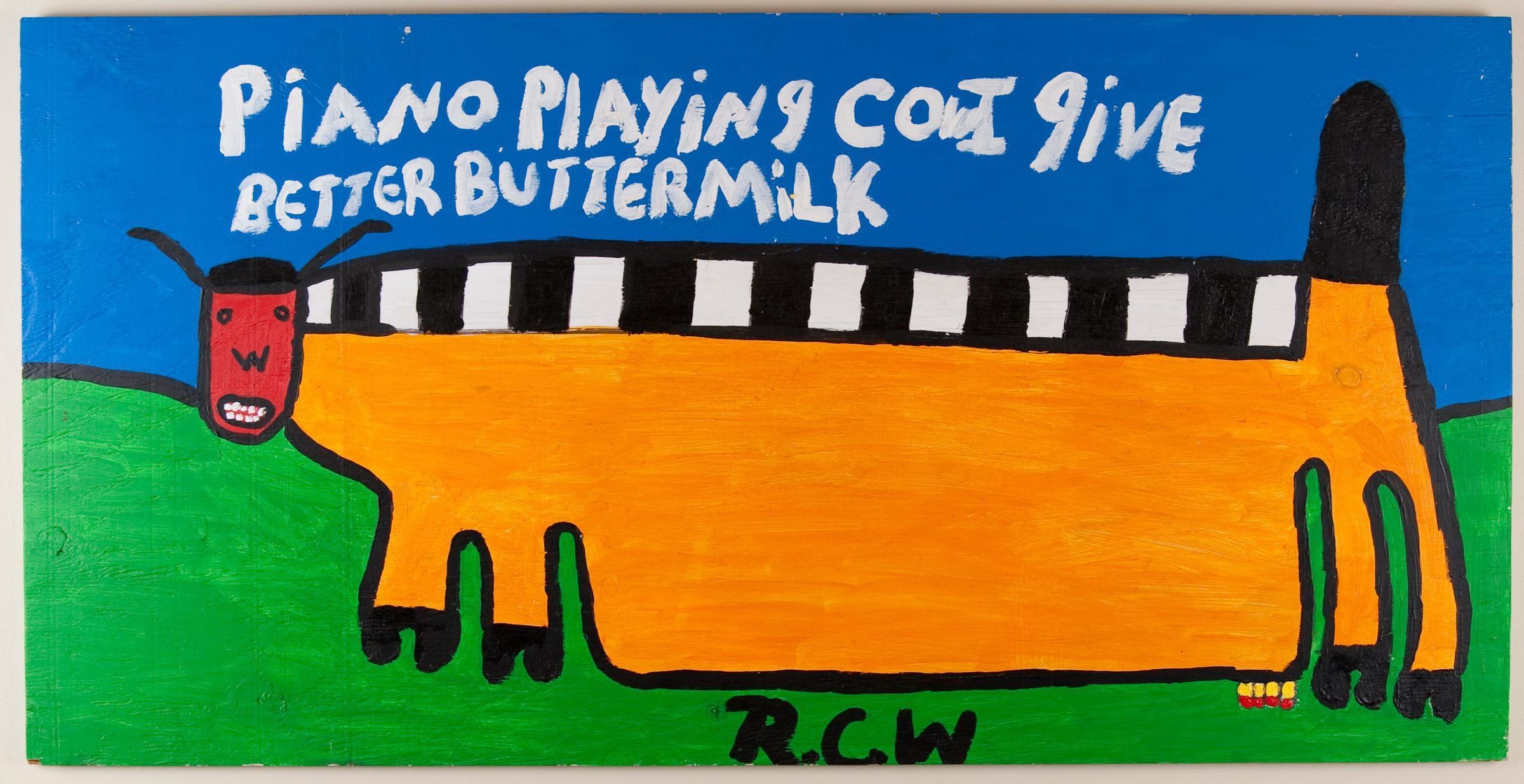 An image repeated often in the Ruby Williams’‚ work, this orange cow has black and white piano keys across its back, and a small head and small utters. The cow stands in a grass field with the passage written in white above its head, Piano Playing Cow I Give Better Buttermilk. The Gadsden Arts Center exhibited this work in the exhibition, Vernacular Art from the Hill Collection, August 28 - October 25, 2009.Collection