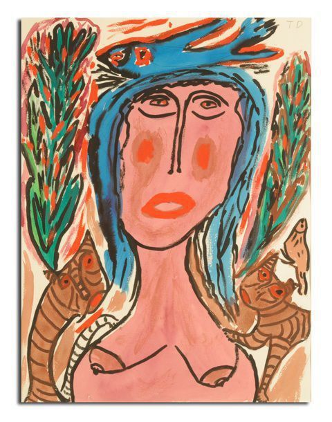 This work is a painting of the upper torso of a nude female executed in colors of purple, blue, red, and green. Two tigers, on either side of the woman, may be trying to comfort the woman by placing their paws on her shoulders. Two large trees flank the woman’‚s head, while one large blue bird flies above her head, and a small bird hides behind one of the tigers. Thornton Dial began painting and drawing images of women on paper after an exhibition of his work in 1990 called Ladies of the United States, at Kennesaw State College in Marietta, Georgia. An art critic wrote that Dial couldn't’‚t draw and made women look ugly, which was particularly hurtful to Dial, as he has a huge respect for the female race. He was raised by women, and believes women carry strength, power, and love. Dial says that man would lose his ’struggle’ without women’s strength and love. Dial would draw and paint images of women till his death in 2016.Artwork Details