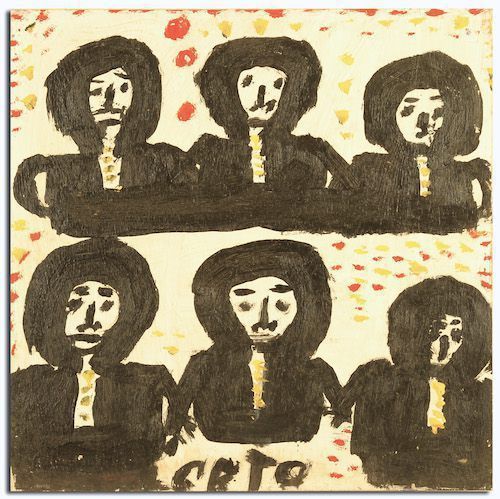 This painting by Mary Tillman Smith depicts 6 figures in black with yellow buttons surrounded by yellow an red dots on a white background. The letters CRTO are written at the center bottom. Born in 1904 in Martinville, Mississippi, Mary Tillman Smith was the third of 13 children in her family who grew up working on a sharecrop farm. From an early age, her family knew she was very intelligent but a severe hearing impairment made her speech difficult to understand, and made her an outcast in local society. She went to school through the 5th grade, where she first found an outlet from her alienation by drawing in the dirt at recess and adding funny text to her drawings.Collection