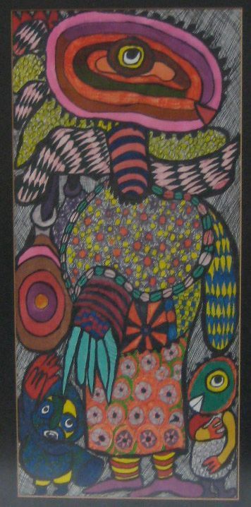 The main bird-like figure of this tapestry painting by Chief Oloruntoba takes up the majority of the space while two smaller figures, with bird-like heads, flank its sides. The largest figure is possibly a mother to the small birds as she is dressed in an apron and has one feathered wing outstretched in a protective gesture. The small bird on the left raises its wings as if to catch the attention of the viewer, and the bird on the right clutches its chest with its right three-fingered hand. The artist created the drawing with pen and marker on fabric (possibly canvas) and the work is framed with a black mat behind glass.