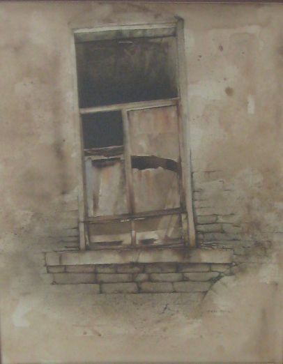 Probably completed around the time of his high school graduation in 1975, this watercolor by Dean Mitchell examines a dilapidated window of a brick building executed in muted browns and grays. The window is the focus of the painting as the background recedes into a tan-washed fog.Artwork Details