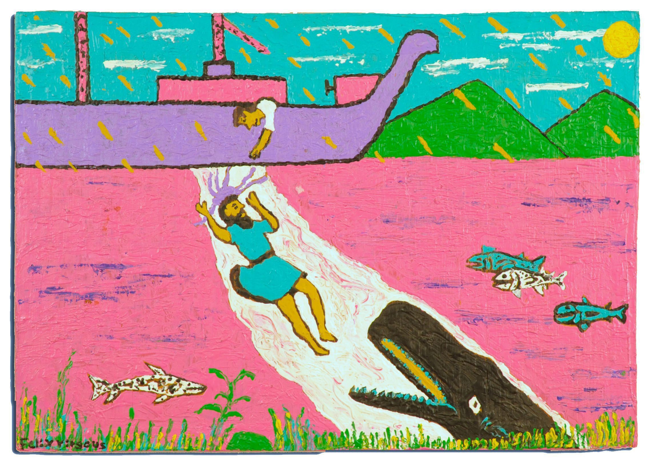 The artist, Felix Virgous known as Harry, often depicted biblical scenes, like the one seen here of Jonah and the Whale. Image of the biblical scene, Jonah and the Whale. The artist first collaged newspaper on board and painted the scene on the newspaper. On the back of the board, "Jonah and the Big Fish" is written and the numbers "70", possibly indicating the date created.Artwork Details