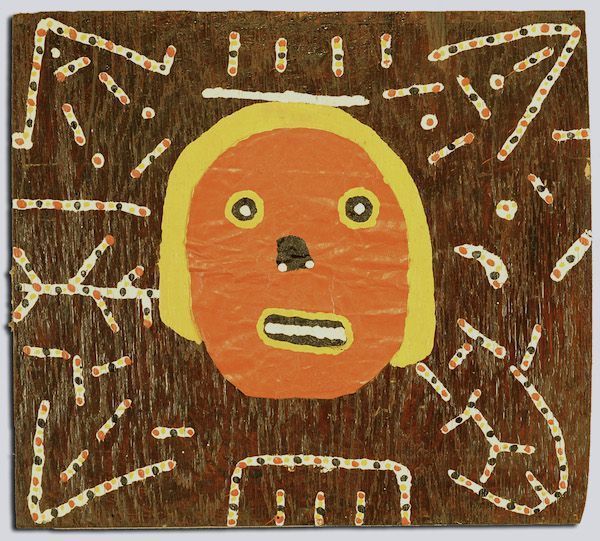 The King Suffering is a painting and collage work featuring the floating head of a red-faced King with a yellow crown that is centered on a dark brown background surrounded by white symbols. These lines are arranged in a partly symmetrical pattern, each containing red, yellow and black dots. The face is the only relief image, created from a thick paper, painted, and attached to the plywood.Collection