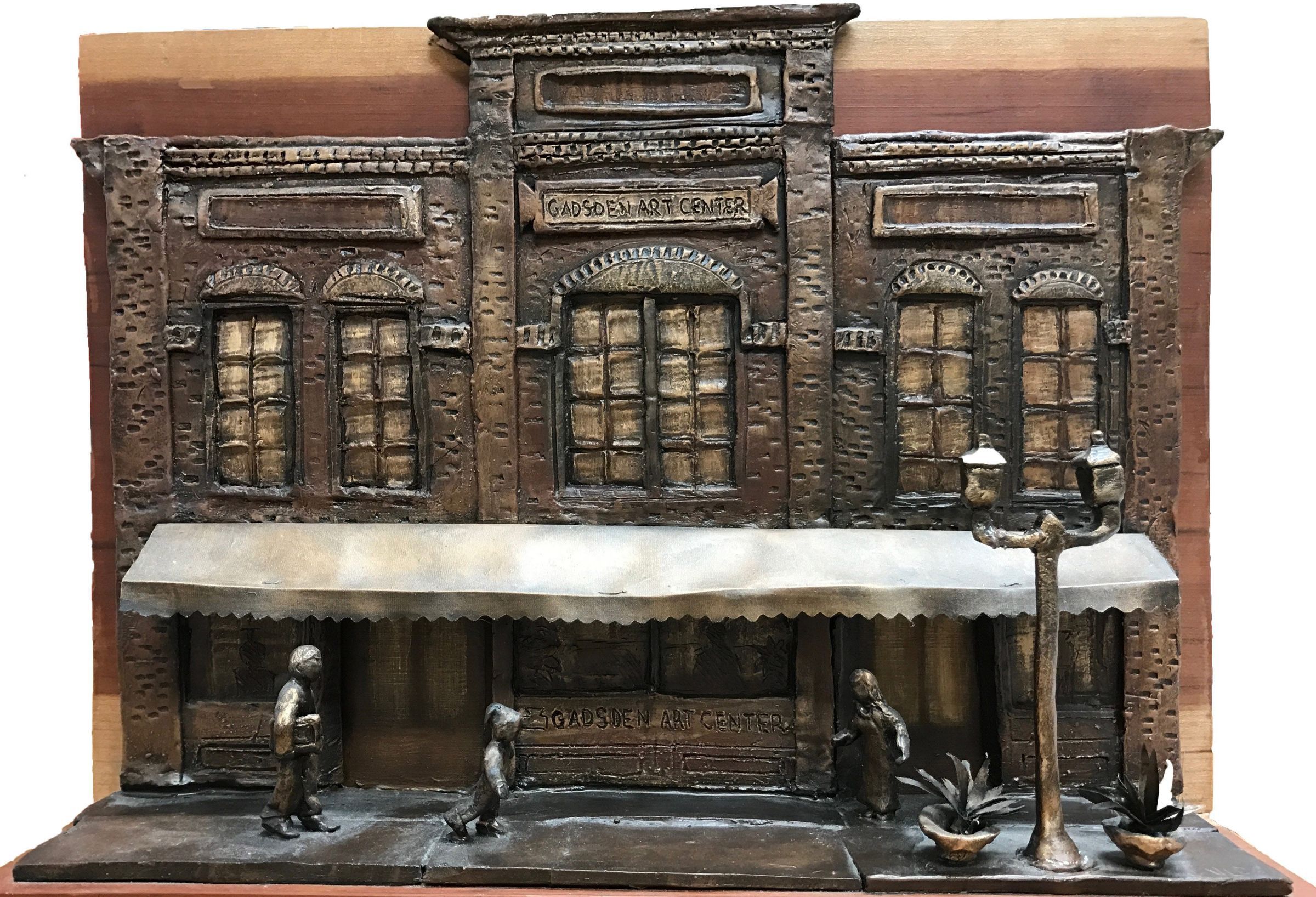 Havana artist Virginia "Ginny" Coultas created this clay deptiction of the Gadsden Arts Center & Museum exterior in 2005. This sculpture was given to founding Gadsden Arts director, Zoe Golloway, in 2005 at her retirement party. Zoe is depicted as the girl walking down the sidewalk in front of the building.Collection