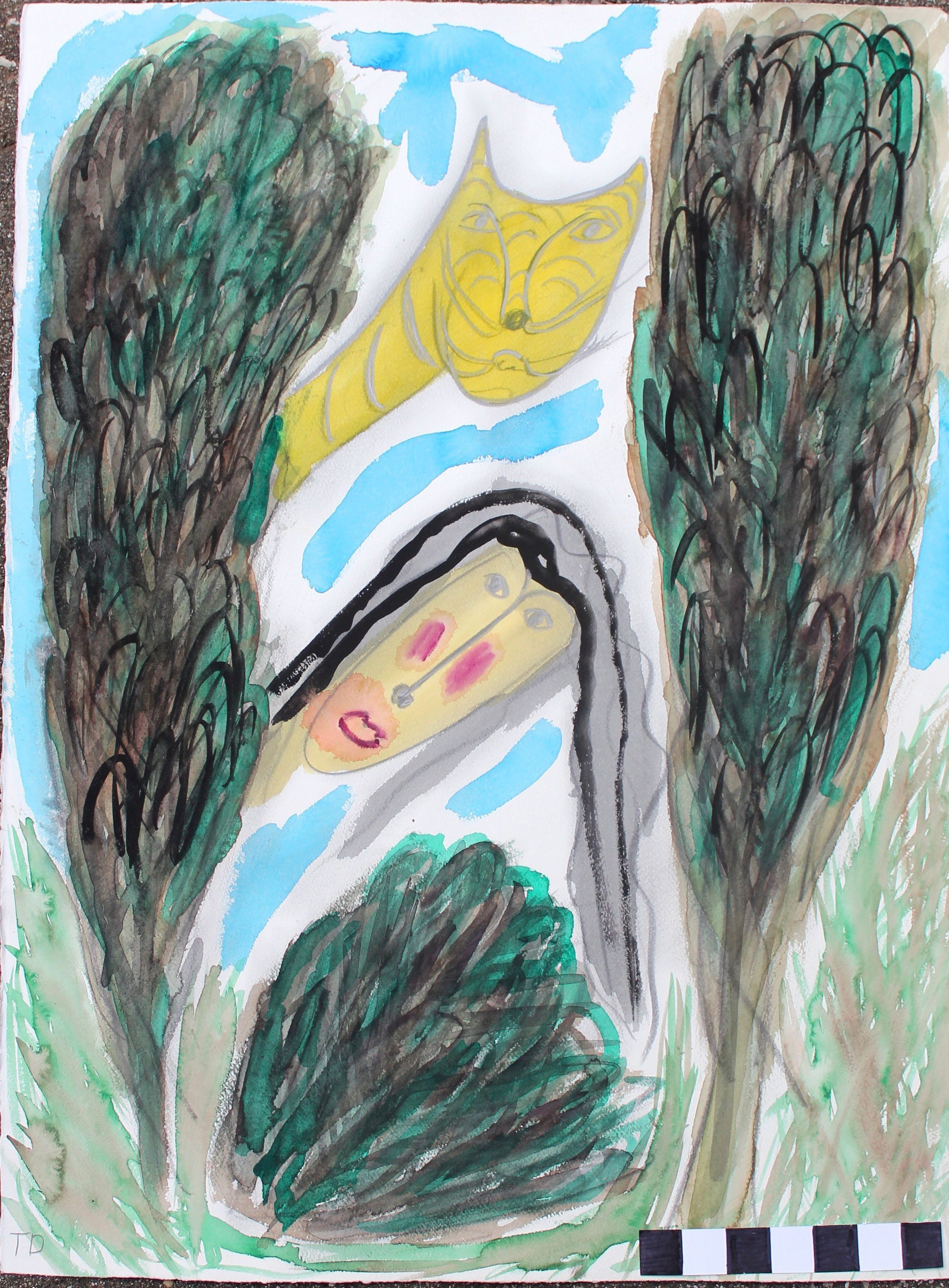 In Jungle Picture, Dial portrays a yellow tiger and a woman with dark hair peeking out from behind two tall green bushes. Dial often made art that spoke to nuances of the relationships between men and women. To Dial, women were sexual and nurturing; both of these conditions being natural and worth celebrating. He used iconographic imagery, often in the form of animals, to express his concepts. Tigers in Dial's pieces are often representative of Dial himself and aspects of the African American male experience. The tigers are portrayed as the energetic element of the composition’_frolicking around the women in his pieces, curling in the presence of those women, and exposing their underbellies for feminine consumption, as well as masculine satisfaction. This was intended to portray men as being strong, stealthy, and subtly dangerous, much like a wild tiger, while simultaneously succumbing to the seductions of women, serving them, and ultimately being domesticated by them.Artwork Details