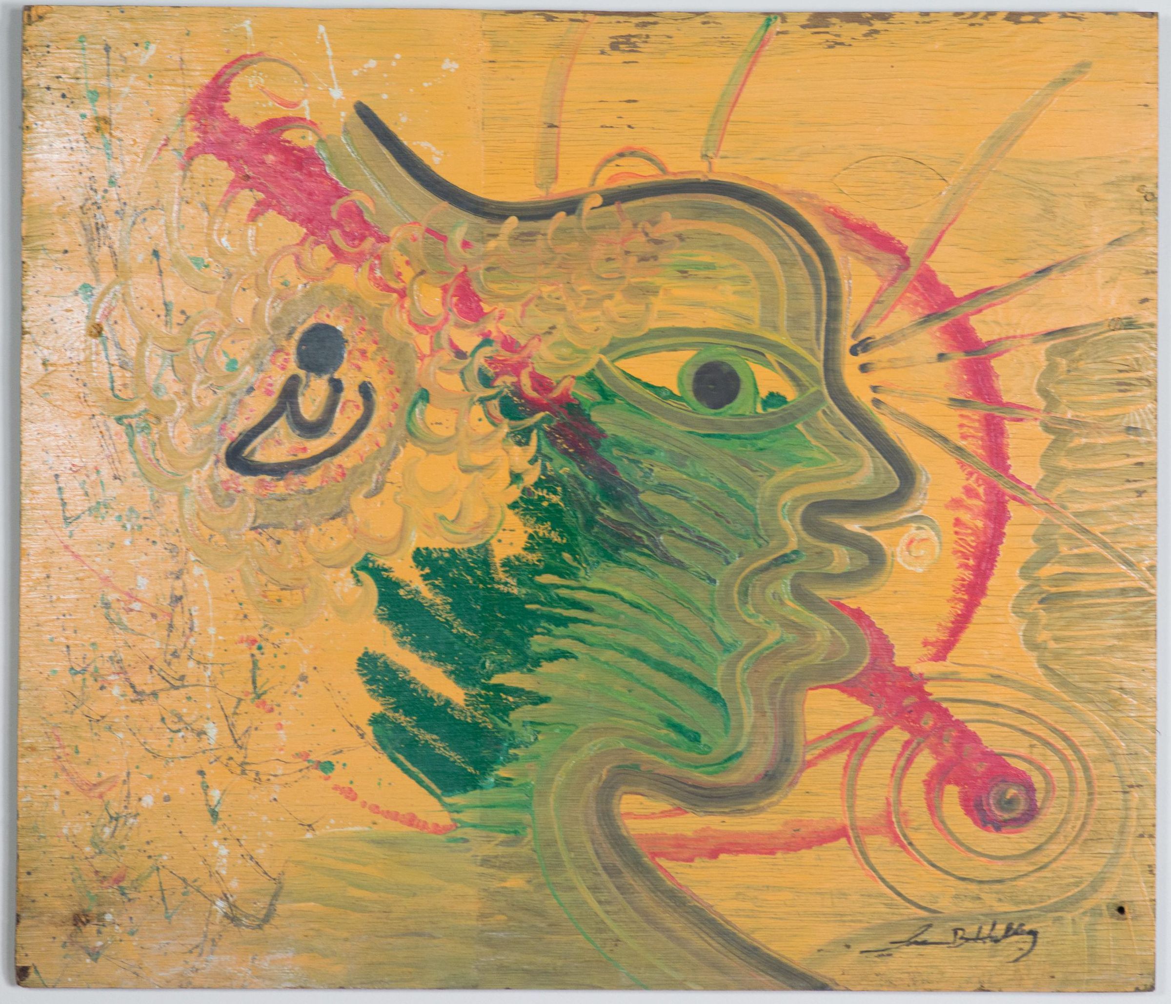 In this painting, Holley depicts a face set in profile, executed in a muted green palate. Inside the figure's head, as if a part of its mind, is a small black figure curled up like a baby. In the background the figure of a sun or pulsing energy source encases the head, rays emitting ambiguously from both the head and the sun's red sphere. Holley believes divine intervention led him to create his artwork, and thus deep religious faith underlies many of his works, inspiring his use of symbolism and granting his art an autonomous life-force. The work is painted on found materials, as was Holley's common practice.Collection