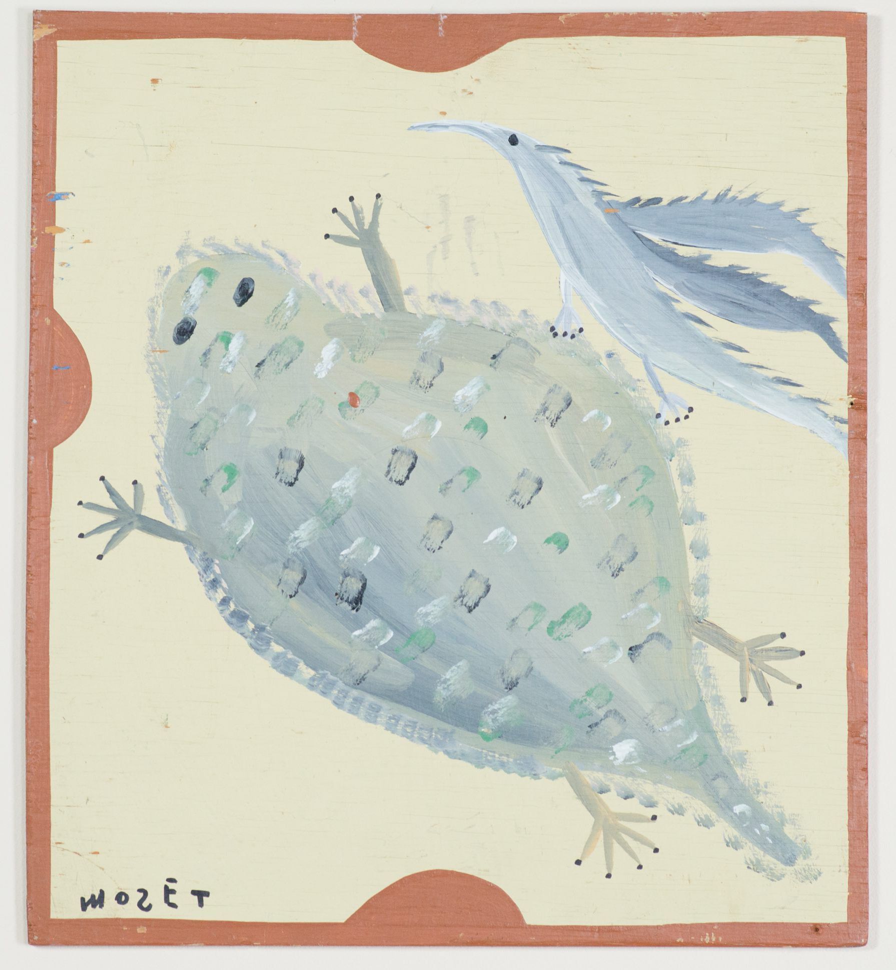 Rendered in greys, whites, and greens on a yellow background, Mose Tolliver depicts a bird and a scorpion, framed within a brown linear border. A soda-can tab was adhered to the piece by the artist and used as a hanging device.Collection