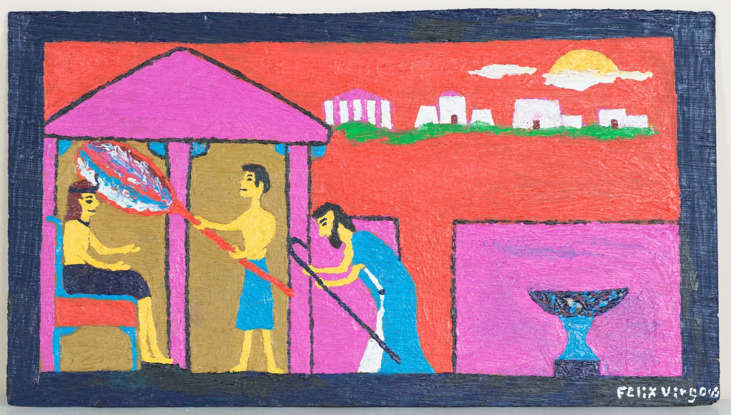The artist Felix Virgous is best known for portraying narrative images pulled from biblical stories. In this painting, Virgous depicts the figure of Moses, the prophet who led the Exodus of the Israelites out of Egypt by crossing the Red Sea, bowing at the feet of Ramses, the Egyptian Pharaoh, as he is being fanned within his temple. In the background stands a city, possibly signifying Ramses' kingdom. The painting is dimensionally flat, executed in highly saturated bright colors, typical of Virgous due to the artistic influence of friend and Vernacular artist, Joe Light.Artwork Details