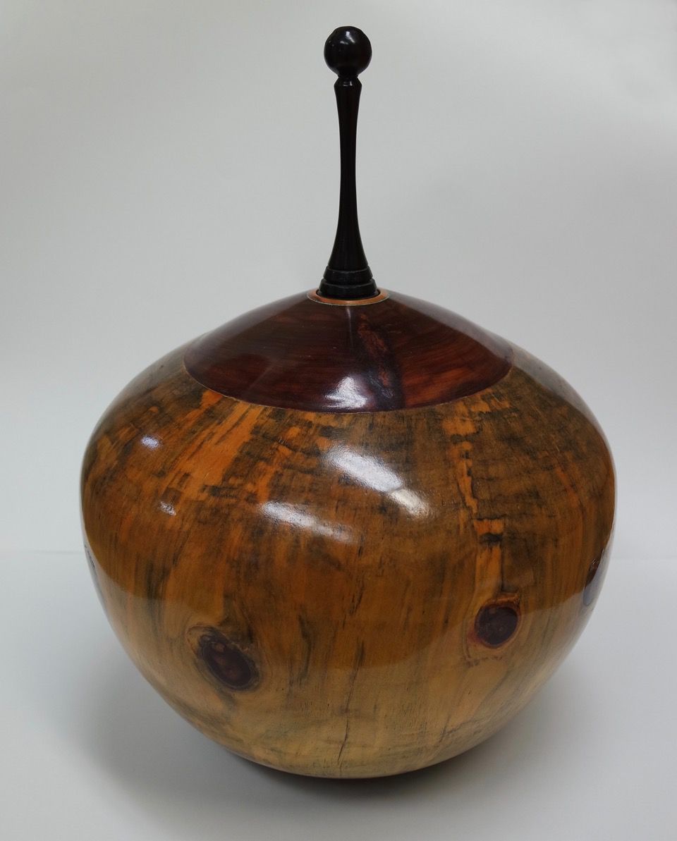 This turned wood bowl was created by Bob Fincher (1933-2016) using multiple types of wood including Norfolk Island Pine, Cherry, Red Cedar, and African Blackwood. It also features a touch of Turquoise. The piece stands at 15 inches high and 11 inches wide. The body is made of the Pine and Cherry, the rim is made from the Cedar, and the knob at the top is made from the African Blackwood. The piece was featured in Art in Gadsden in 2007 and was awarded second place. All the materials used by Bob in his woodturnings come from sustainable and sound reforestation programs of certified and environmentally sensitive timber merchants. Bob believed that we have an obligation to the earth and its resources.Artwork Details