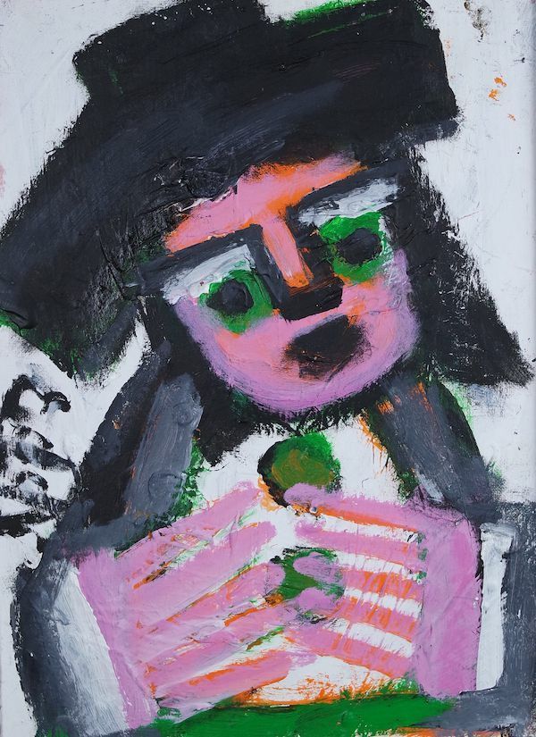 This painting is illustrative of Mr. Eddy's exploration of color and material. Thick, textured marks create visible rifts throughout the work, perhaps a result of painting over a previous work. There is a distinct layering of colors: the comb-like hands typical of his portraits are pink with underlying orange, as well as the face. The figure's hat and buttons appear to carry both black and green, while the jacket contains a layer of gray that could have been added later. There are tints of orange throughout the painting that suggest an overall layer beneath. With Mumma's consistent attention to clothing, it is unsurprising that some of his works contain this kind of masking that could indicate he would paint the figures themselves and then "dress" them with overlapping colors.Collection