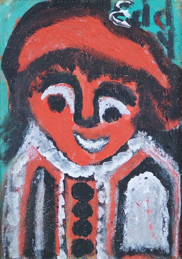 This portrait is distinct in many ways in comparison with Mr. Eddy's overall body of work. A half-length portrait, absent of Mumma's characteristic hands, shows the audience a figure that is almost entirely red with the exception of black and white detailing on its clothes. The figure wears a loose beret on its head, more casual than the headwear adorning many of his other paintings. The shape connecting the eyebrows and nose contain a curvature unusual to his other paintings, and the figure's open-mouthed, white smile also present a unique feature on the portrait. The figure's rounded head and stylistic differences suggest the work is one of his earlier paintings, as he began to grow a fascination with portraiture and abstraction that was not honed into his trademarks.Collection