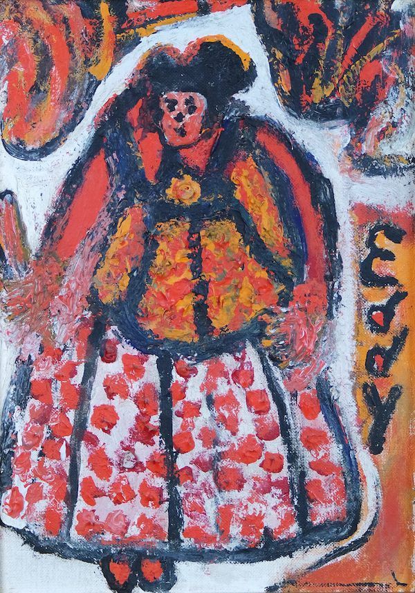 A full-length portrait, uncommon to Mr. Eddy's pattern of work, takes up a majority of the canvas with a luxuriously decorated outfit. While many of Mumma's figures are androgynous, his implementation of clothing often implies status and gender. Here, the figure is dressed in a long white skirt bespeckled with red, a vibrant orange and red shirt, and what appears to be a matching scarlet shawl. There is also a black hat on the figure's head, and sections of fabric-like shapes in the upper corners of the work that echo the colors worn by the subject. The assumption can be made that the figure is a woman, likely an older woman, wearing traditional clothing as indicated by its style and lavishness. Although the work has a white background, the right side is decorated in orange in order to accentuate the large signature, whose "d's" are filled in with red, recalling the pattern on the woman's skirt.Collection