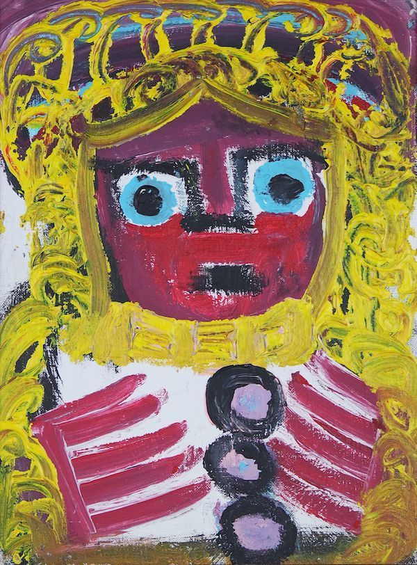 This piece is typical of Mumma's body of work, although it lacks his signature. His characteristic half-portrait is conducted with a purple-tinted red face and large, abstracted hands. Bright yellow curls surround the outskirts of the figure and correspond with the collar of the shirt; at times the paint blends with other colors, creating a dark, nearly brown color. The figure's purple buttons are outlined in thick black paint echoed in the recognizable geometric form of the facial features, particularly the stoic mouth of the subject. Stark blue eyes gaze directly at the viewer, confrontational yet detached.Artwork Details