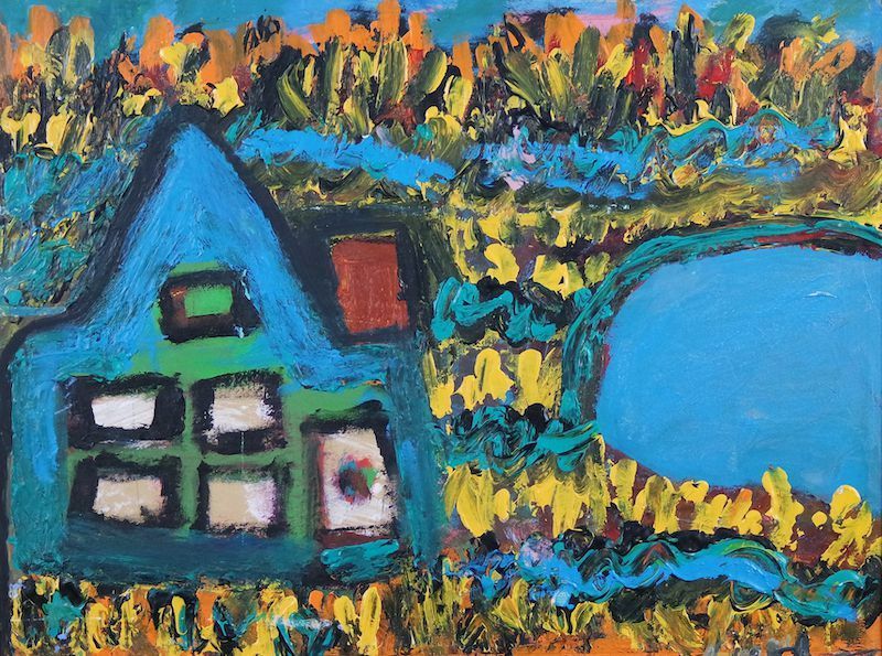 This painting represents an unusual subject matter for Mumma. A horizontal landscape depicts a house painted in blue and green, with numerous windows and a red chimney adorning the flattened building. The background contains yellow-orange autumn foliage and a body of water. The painting does not feature Mr. Eddy's recognizable signature, indicating it may be one of his earlier paintings. While this work is not directly linked to a particular historical artwork, it is reminiscent of Van Gogh's landscape paintings of houses and farmlands. Mumma admired and recreated several Van Gogh paintings, most notably his self-portraits. It is likely he was inspired by works such as "Houses at Auvers," by Van Gogh for this piece. Mumma also spent much of his adult life on a farm, a possible inspiration for the subject matter of this work as well.Artwork Details