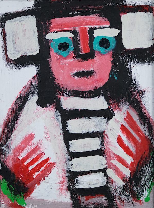Likely an early exploration into what would become the characteristic subject matter of Mumma's paintings, this work portrays a half-length portrait of a figure with salmon-colored skin wearing white clothing and headgear. The figure has Mr. Eddy's recognizable comb-shaped hands, as well as the pronounced facial features. Thick, white eyebrows are congruous to the white outfit and background of the piece. Layers of paint create a textured, combined color scheme including red, white, green, and black. The outlier becomes the turquoise eyes of the figure, brilliant against the surrounding white of the eyebrows and what appears to be a hat. Mr. Eddy's signature is absent from the work.Artwork Details