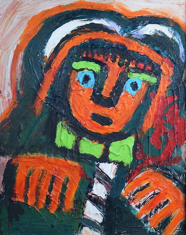 The bold experimentation in this painting stands out against Mumma's generally structured work. This half-length portrait demonstrates a figure that tilts slightly to the right, with a rounded face and adornment on the figure's head. The figure is painted in thick orange with neon green used for the eyebrows and collar, while the figure's clothing is a darker green accented with white. With abstracted hands and pronounced facial features, the work begins showcasing Mr. Eddy's preferences that would later become essential to his work. However, the stark geometry, as well as the bold identification through his signature, are two elements that this piece lacks.Artwork Details