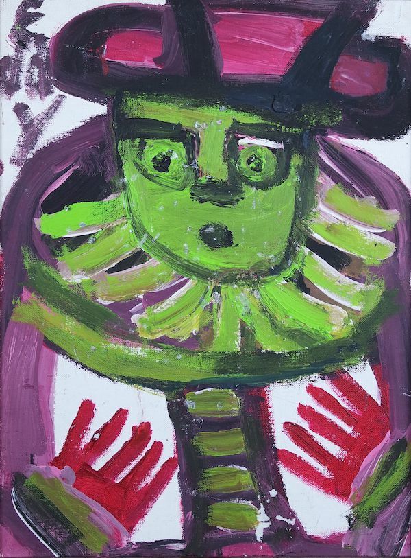Mumma's fascination with vivid colors, opulent wardrobes, and straightforward portraiture are easily observable in this work. This half portrait is rendered in a radiant green for the face, eyes, and ruff collar. The hands, cloak, and top hat of the figure are done in a plum red shade, while the background and shirt are a stark white. The figure's mouth is minutely circular, giving the figure a slightly surprised expression. This is further emphasized by the large, linear eyebrows: one of which is highlighted with a white streak underneath. Unlike many of Mr. Eddy's portraits, the eyes are painted in the same shade of kelly green as the face and collar of the figure. However, their intensity and attention are as unmistakable to Mumma's body of work as the "Eddy" signature on the upper left corner of the painting.Collection