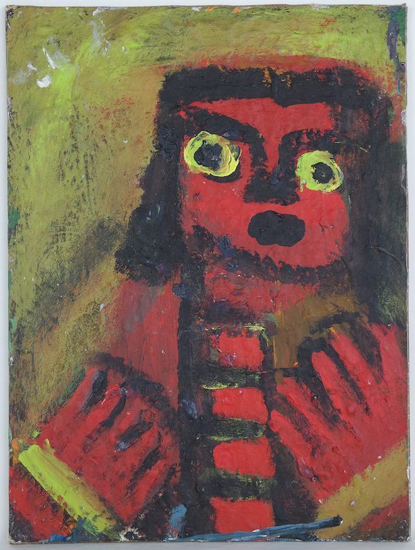 A half-portrait painting that is possibly an early work of Mumma's, given the curvature of the hands and absence of Mr. Eddy's signature. The figure's skin and buttons on its clothes are a deep red, teeming over its rectangular head and black hair. The eyebrow and nose shape of the figure demonstrates Mumma's traditional technique of stylization, including the piercing, circular eyes depicted in this portrait with a lime green paint. The hands of the figure lack Mr. Eddy's typical comb-like shape, more closely resembling the true shape of fingers. Nonetheless, their importance to the portrait exemplifies the fascination he had with hands early in his painting career. Their intense red is offset by the sleeves of the figure's jacket, each representative of the colors in the background: a vibrant chartreuse and a more muted, neutral yellow-beige paint. In the background, they are merged and layered over one another with streaks of black. There is a splash of white paint in the upper left corner that may have been a result of Mr. Eddy's disorderly inventory of his paintings; often times, he leaned wet canvases against one another, leading to the destruction of both paintings.Artwork Details