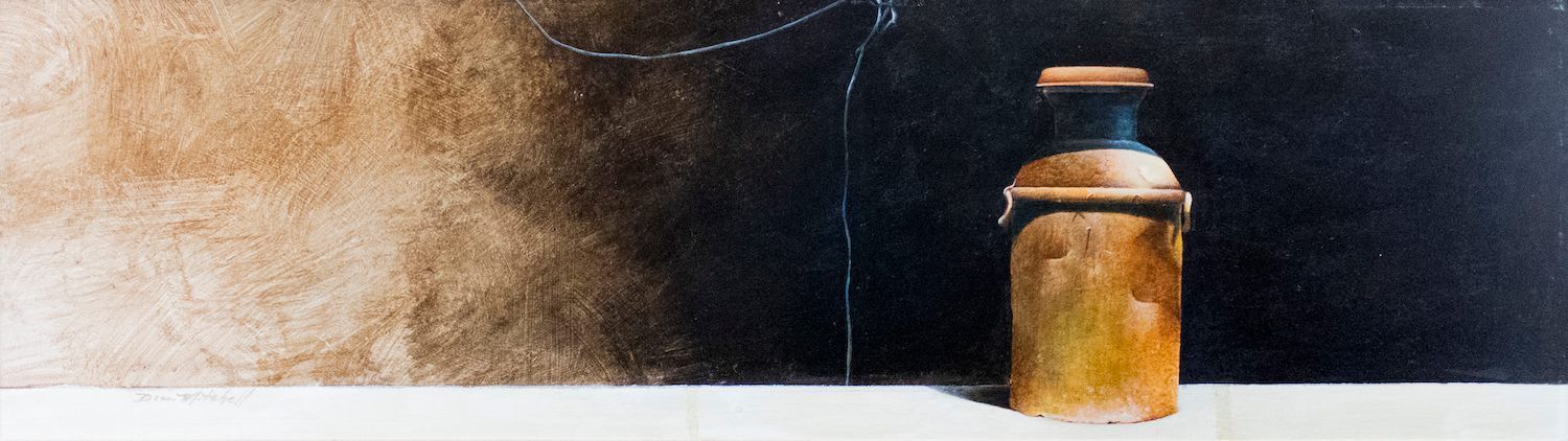In this mixed media panoramic, Mitchell presents a still life of a single jug against a dramatically lit background. Heavy brushstrokes can be seen on the lighter side of the background, but they grow faint, as his use of paint gets heavier and darker to the right. Contrasting earth tones cause the viewer's eye to rest on the copper-colored jug, resting on a smooth white surface against the dark background. The jug is lit from its right side, which bring out the small dents and cracks on its shiny surface.Acquisition