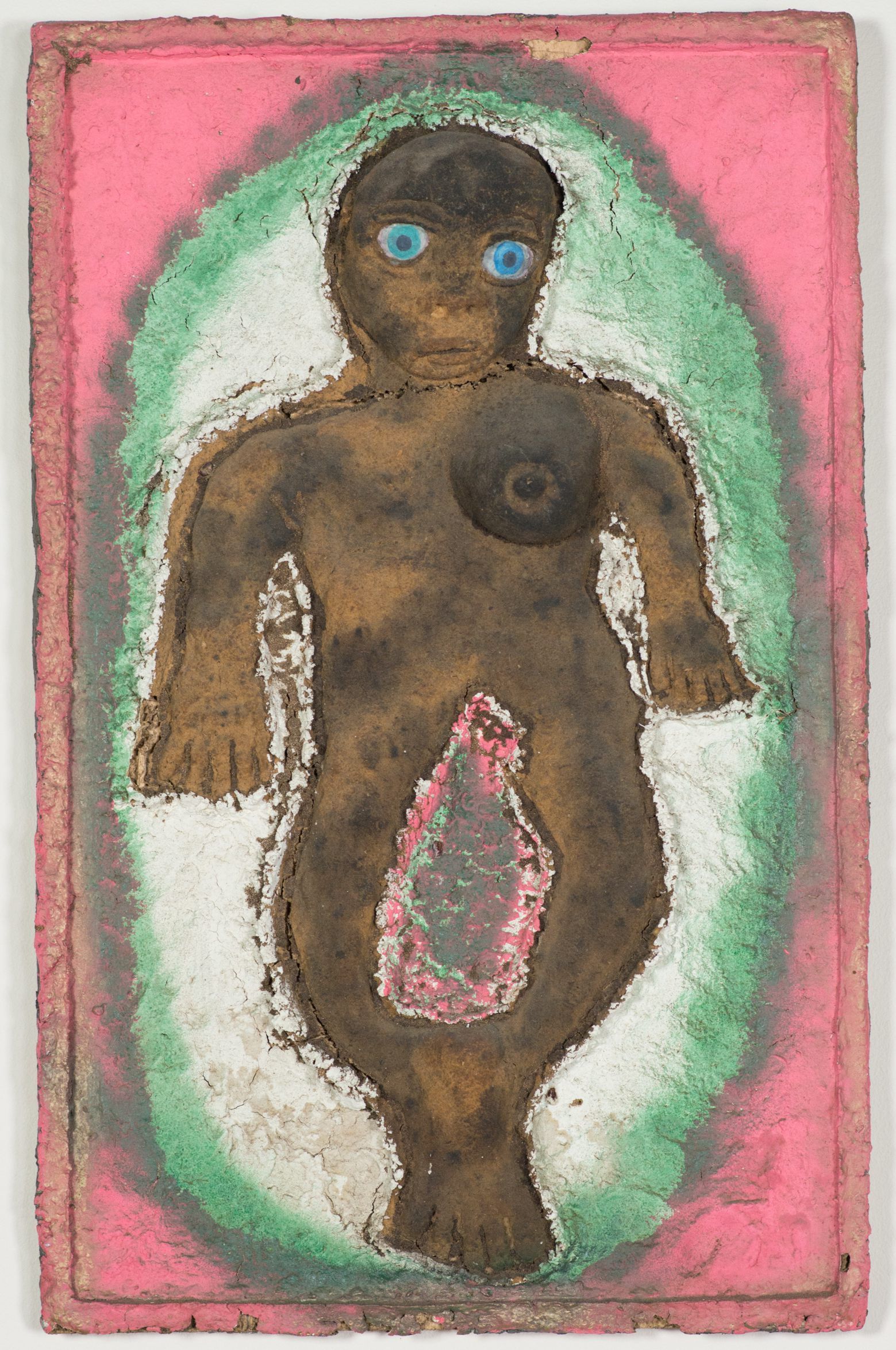 Vernacular artist, Archie Byron, creates his sculptures through a process that includes root sculpting, drawing, and painting using a mix of sawdust and glue. This mixture forms a thick paste that is then applied slowly in many layers; each layer having to dry in between. This piece portrays a nude female figure with one breast removed. She lays surrounded by a halo of white, green, and pink. Much of Byron's work is inspired by religious or political themes along with a mixture of his Native American, African American, and European heritages. Today his works are featured at Atlanta's Folk Art Park, the Smithsonian American Art Museum, and the High Museum of Art.Artwork Details
