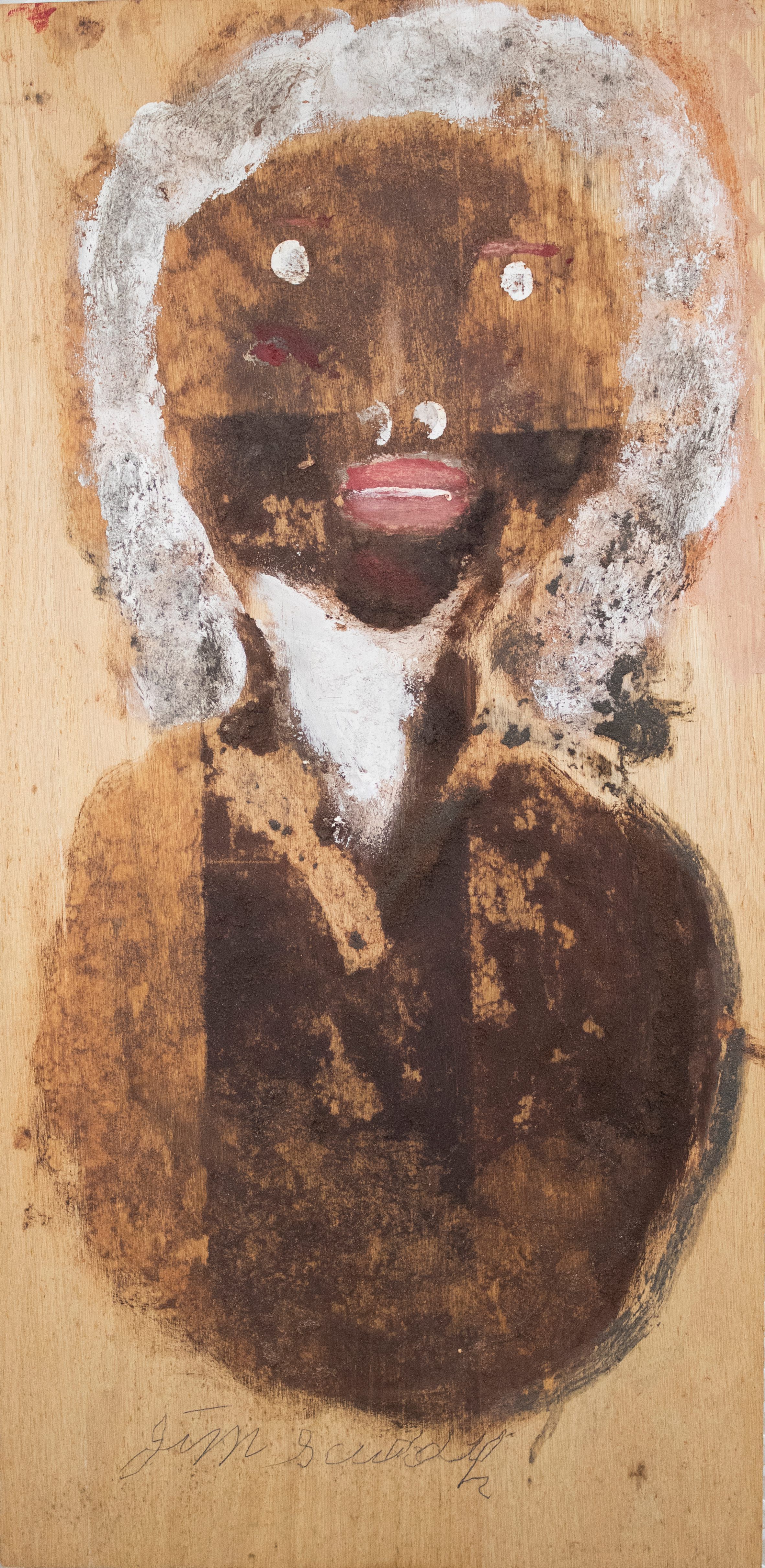 The female figure in this half portrait is depicted with shoulder-length white hair, suggesting her age. Early Vernacular artist, Jimmy Lee Sudduth, used his fingers to paint many of his pieces, along with a homemade medium of dirt, clay, berry juices, leaves, sugar, coffee grounds, and ashes. Growing up in the South with a Native American mother, Jimmy was influenced by her knowledge of plants and herbal medicine. He portrayed a wide range of subject matter, but mainly featured people and places of Fayette County, Alabama where he grew up.Artwork Details