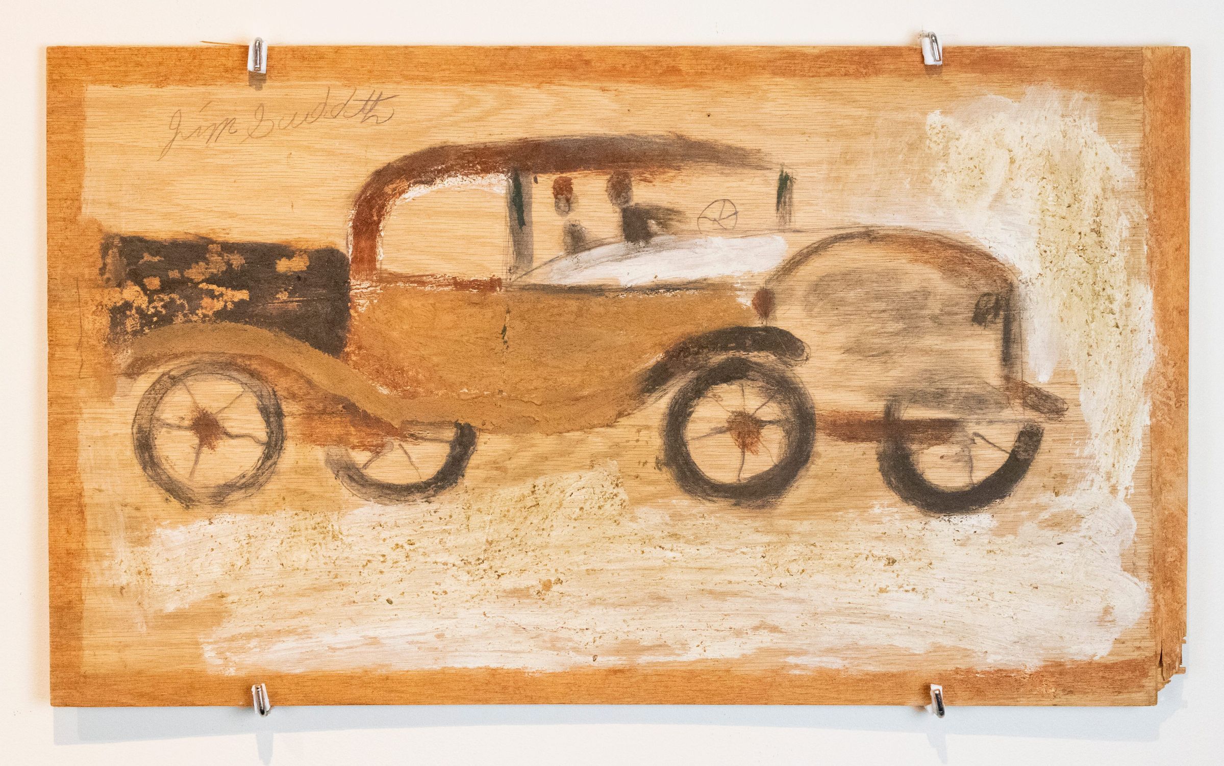 This piece features an old fashioned truck depicted from the side, with two riders. It is framed by a light brown border. Like much of Jimmy Lee's work, it is painted with his unique blend of earth pigments on plywood. The truck scene was most likely inspired by his life in Fayette County Alabama. His work has been shown in many notable places such as the Smithsonian's Bicentennial Festival of American Folk Art, the Today Show, and 60 Minutes.Artwork Details