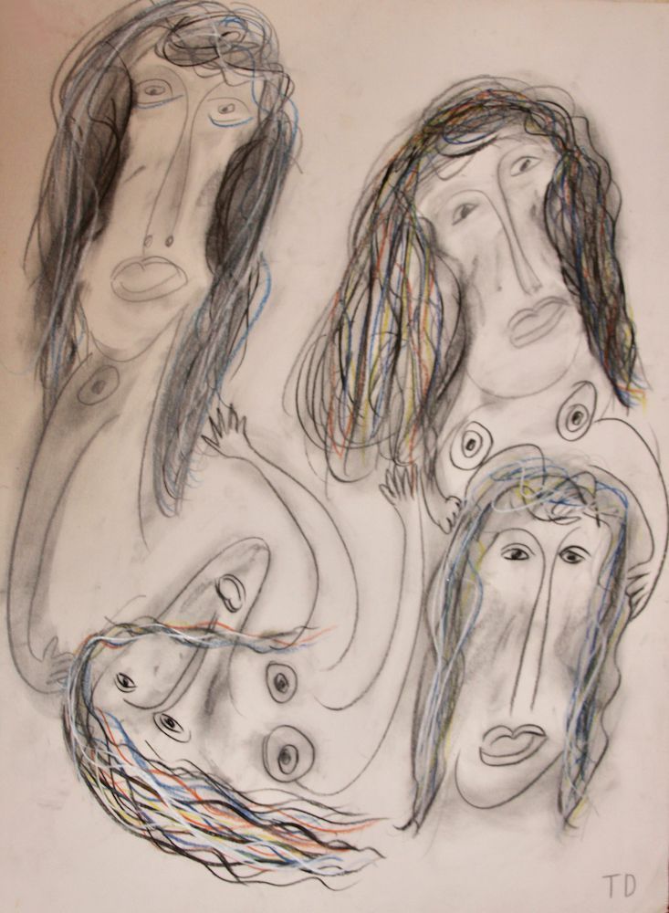 In this scene, Dial uses charcoal and pencil to portray four nude women styling of seduction and refuge. He was once criticized by a journalist who claimed his portrayal each other's hair. Dial was raised by women and as such reveres them as strong, powerful and nurturing. Thus, he chose to paint them nude, appreciating them as figures of women was "crude" and lacked talent. This deeply offended them because of his great respect for the females. He paints women as generalized, sexualized, poetic figures in his admiration for them.Artwork Details