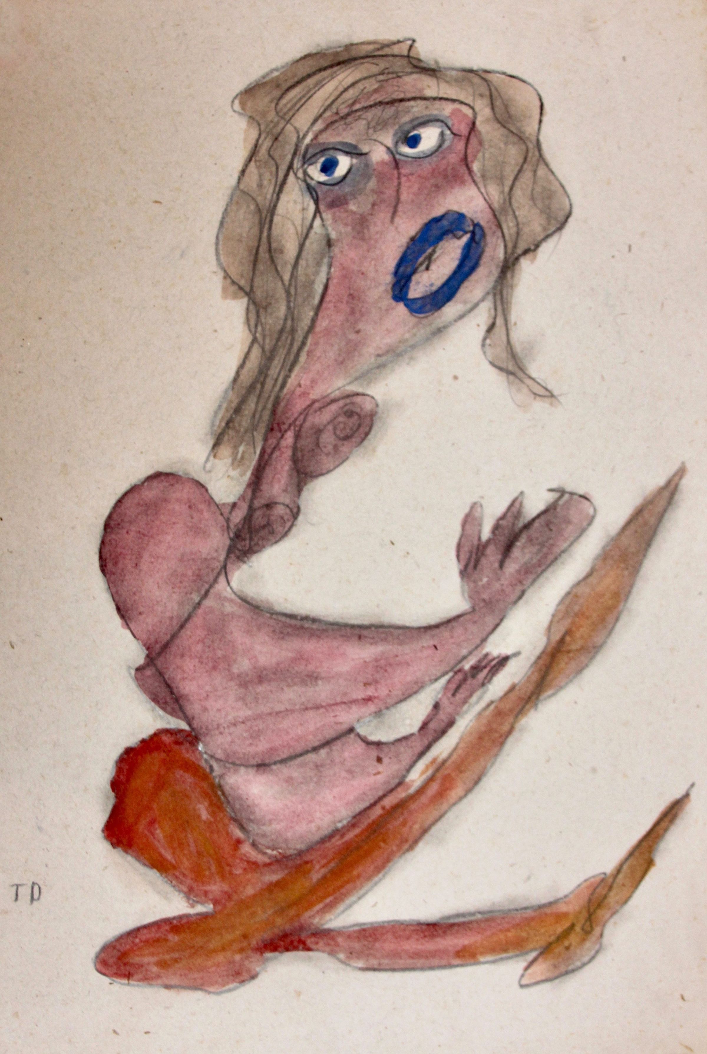 This line drawing and watercolor female figure with blue lips, sits cross-legged and almost appears to be holding a book in her hand. She is nude, as is consistent with Dial's portrayal of women, whom he highly revered as strong and powerful. Dials work touches on themes of racial inequality, struggles in the modern world, and relationships between men and women.Artwork Details