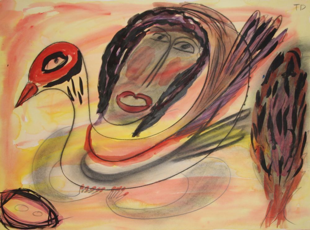 Of several works titled Life Go On, this particular piece features a woman with dark hair holding a bird. The bird has a bright red head, with sharp eyes and a multicolored body. To the right of the woman and bird sits a large tree. The drawing, done in dark lines of charcoal, is surrounded by rainbow hues of watercolor to create the captivating scene.